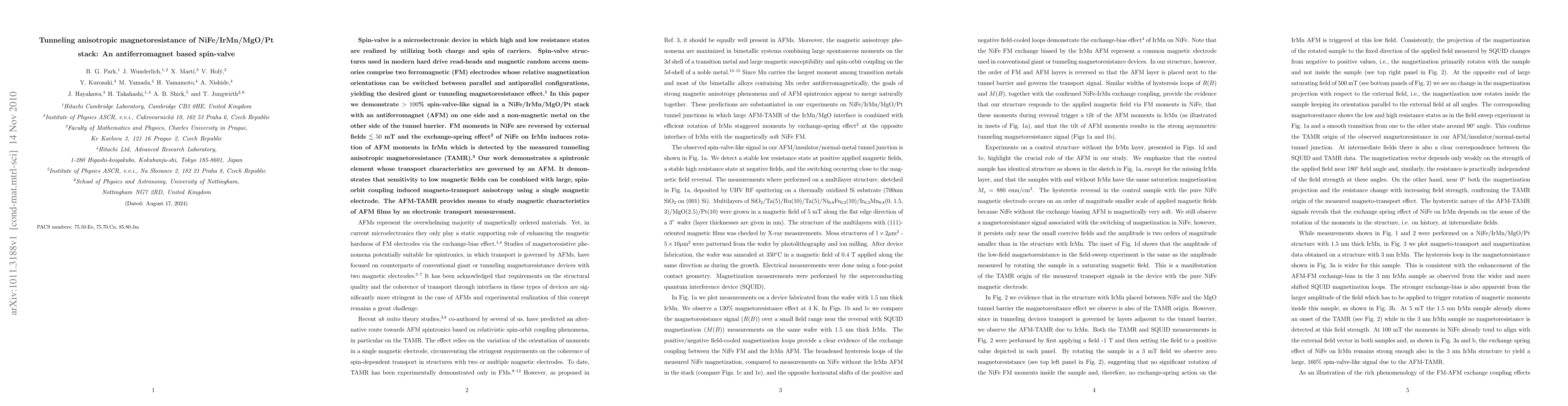 This paper demonstrates a >100% spin-valve-like signal in a NiFe/IrMn/MgO/Pt stack using an antiferromagnet (AFM) and a non-magnetic metal, showing large tunneling anisotropic magnetoresistance (TAMR). The study reveals the potential of AFM-based spintronic elements for low-field sensitivity and high magneto-transport anisotropy.