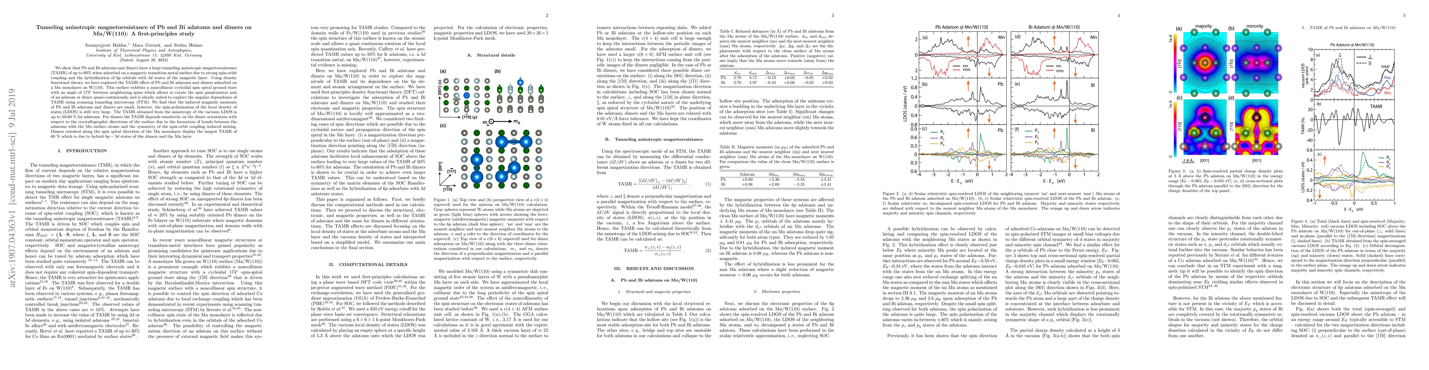 This study reveals that Pb and Bi adatoms and dimers exhibit significant tunneling anisotropic magnetoresistance (TAMR) up to 60% on a Mn/W(110) surface due to strong spin-orbit coupling and orbital hybridization. The Mn surface's unique spin spiral structure allows for detailed exploration of TAMR via scanning tunneling microscopy.