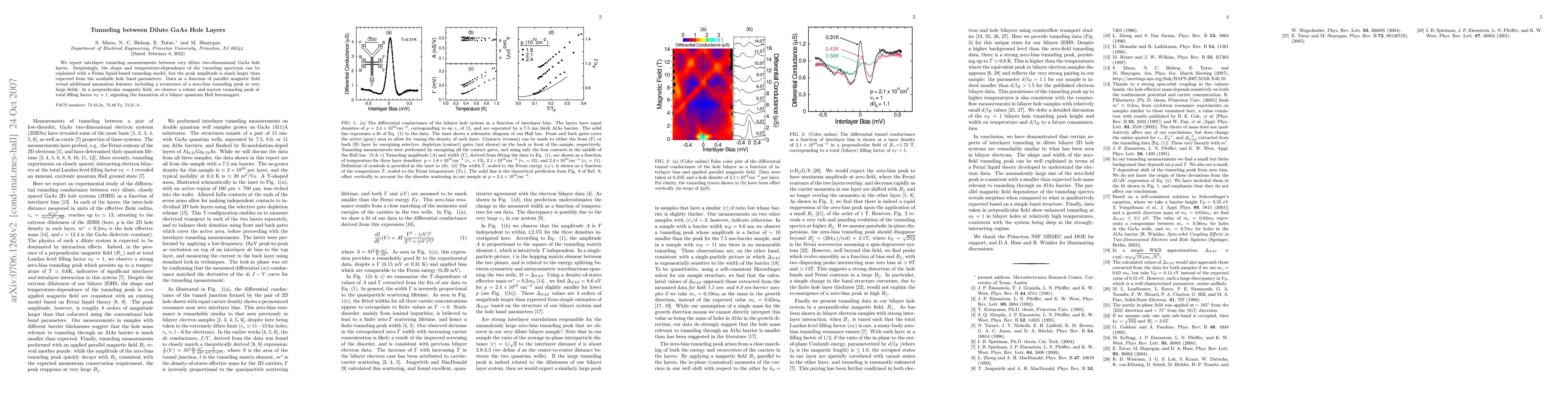 We report interlayer tunneling measurements between very dilute two-dimensional GaAs hole layers. Surprisingly, the shape and temperature-dependence of the tunneling spectrum can be explained with a Fermi liquid-based tunneling model, but the peak amplitude is much larger than expected from the available hole band parameters. Data as a function of parallel magnetic field reveal additional anomalous features, including a recurrence of a zero-bias tunneling peak at very large fields. In a perpendicular magnetic field, we observe a robust and narrow tunneling peak at total filling factor $\nu_T=1$, signaling the formation of a bilayer quantum Hall ferromagnet.