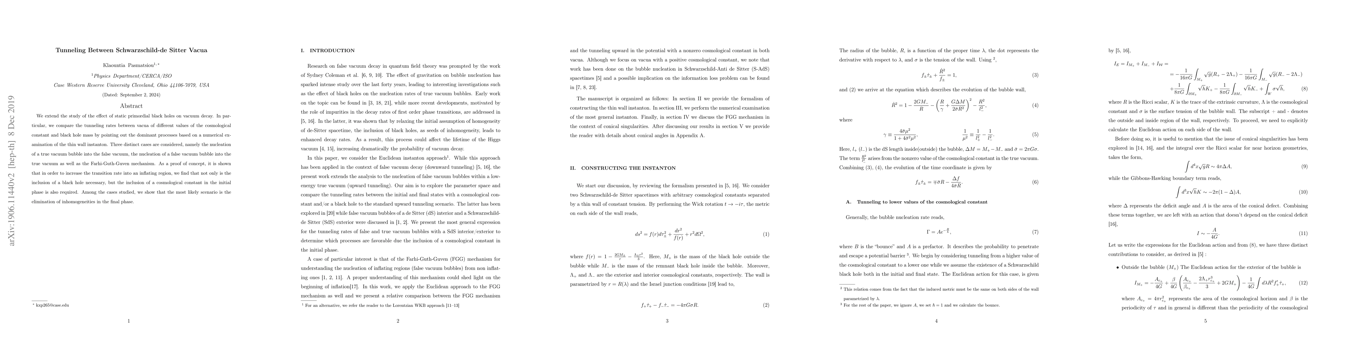 We extend the study of the effect of static primordial black holes on vacuum decay. In particular, we compare the tunneling rates between vacua of different values of the cosmological constant and black hole mass by pointing out the dominant processes based on a numerical examination of the thin wall instanton. Three distinct cases are considered, namely the nucleation of a true vacuum bubble into the false vacuum, the nucleation of a false vacuum bubble into the true vacuum as well as the Farhi-Guth-Guven mechanism. As a proof of concept, it is shown that in order to increase the transition rate into an inflating region, we find that not only is the inclusion of a black hole necessary, but the inclusion of a cosmological constant in the initial phase is also required. Among the cases studied, we show that the most likely scenario is the elimination of inhomogeneities in the final phase.