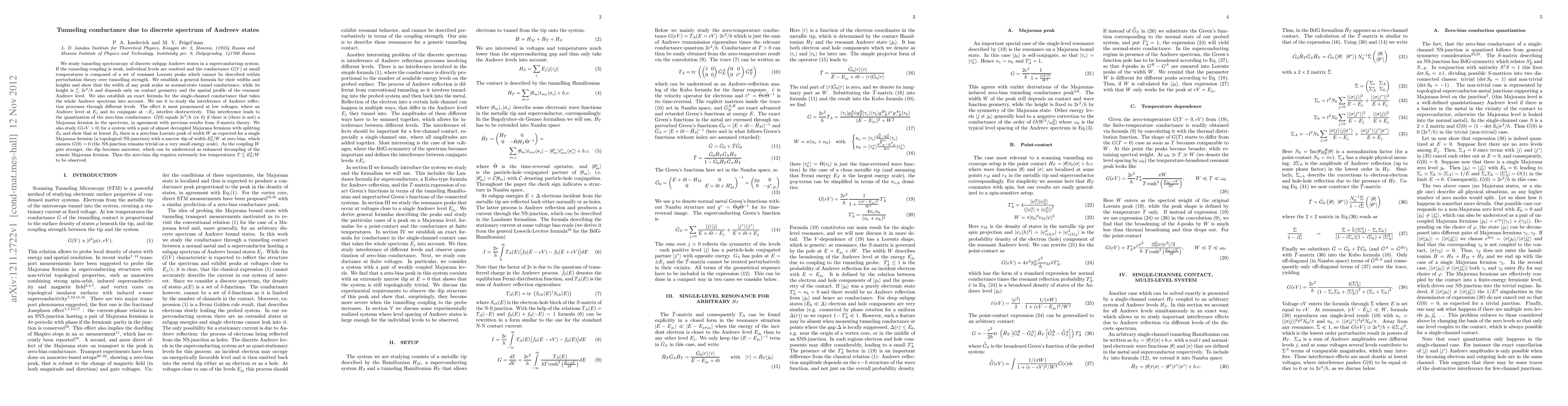 We study tunneling spectroscopy of discrete subgap Andreev states in a superconducting system. If the tunneling coupling is weak, individual levels are resolved and the conductance $G(V)$ at small temperatures is composed of a set of resonant Lorentz peaks which cannot be described within perturbation theory over tunnelling strength. We establish a general formula for their widths and heights and show that the width of any peak scales as normal-state tunnel conductance, while its height is $\lesssim 2e^2/h$ and depends only on contact geometry and the spatial profile of the resonant Andreev level. We also establish an exact formula for the single-channel conductance that takes the whole Andreev spectrum into account. We use it to study the interference of Andreev reflection processes through different levels. The effect is most pronounced at low voltages, where an Andreev level at $E_j$ and its conjugate at $-E_j$ interfere destructively. This interference leads to the quantization of the zero-bias conductance: G(0) equals $2e^2/h$ (or 0) if there is (there is not) a Majorana fermion in the spectrum, in agreement with previous results from $S$-matrix theory. We also study $G(eV>0)$ for a system with a pair of almost decoupled Majorana fermions with splitting $E_0$ and show that at lowest $E_0$ there is a zero-bias Lorentz peak of width $W$ as expected for a single Majorana fermion (a topological NS-junction) with a narrow dip of width $E_0^2/W$ at zero bias, which ensures $G(0)=0$ (the NS-junction remains trivial on a very small energy scale). As the coupling $W$ gets stronger, the dip becomes narrower, which can be understood as enhanced decoupling of the remote Majorana fermion. Then the zero-bias dip requires extremely low temperatures $T\lesssim E_0^2/W$ to be observed.
