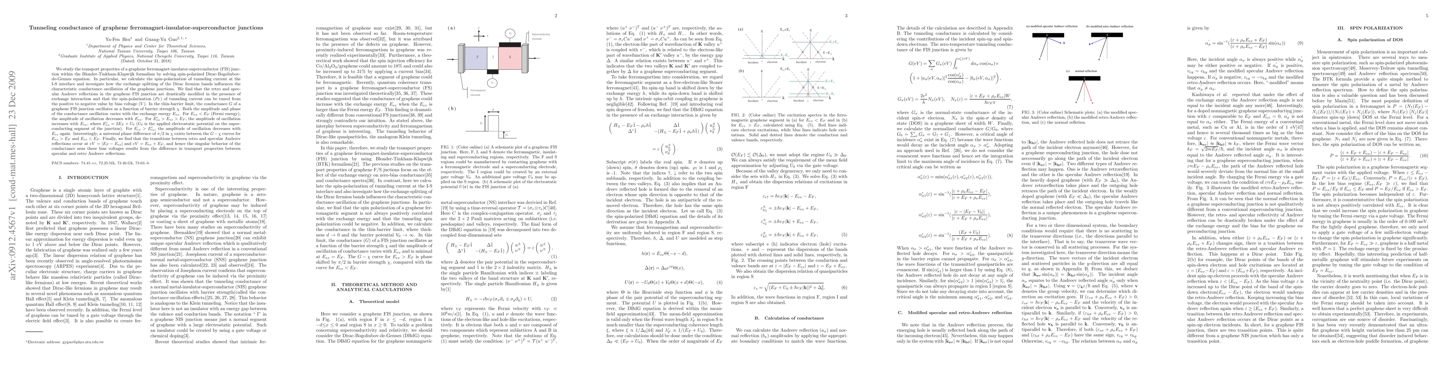 Researchers studied graphene ferromagnet-insulator-superconductor junctions, finding that spin-polarized tunneling current can be controlled by bias voltage and exchange interaction, leading to oscillations in conductance with varying amplitude and phase.