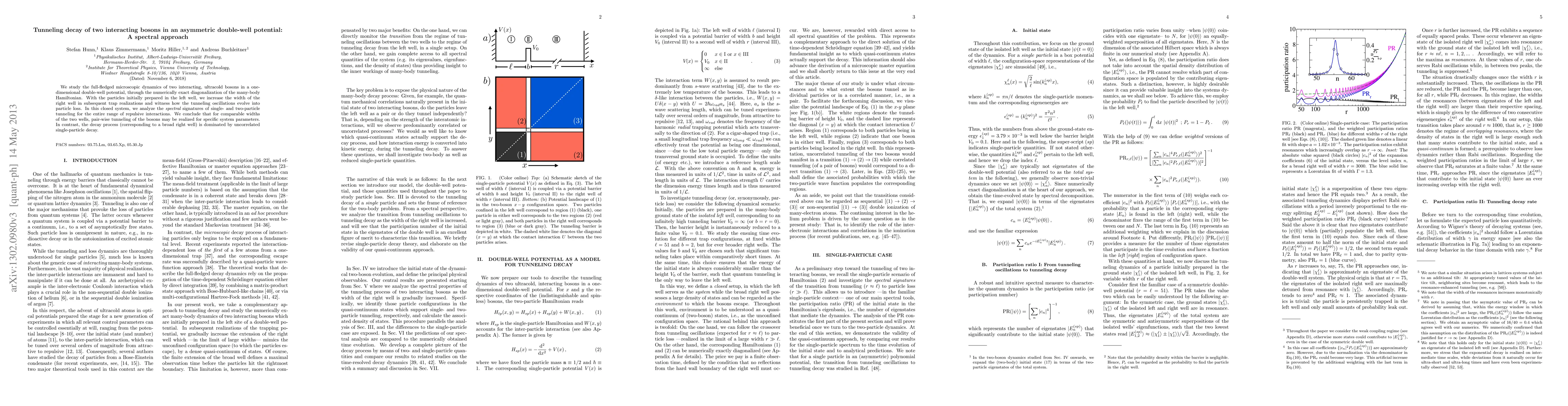 We study the full-fledged microscopic dynamics of two interacting, ultracold bosons in a one- dimensional double-well potential, through the numerically exact diagonalization of the many-body Hamiltonian. With the particles initially prepared in the left well, we increase the width of the right well in subsequent trap realizations and witness how the tunneling oscillations evolve into particle loss. In this closed system, we analyze the spectral signatures of single- and two-particle tunneling for the entire range of repulsive interactions. We conclude that for comparable widths of the two wells, pair-wise tunneling of the bosons may be realized for specific system parameters. In contrast, the decay process (corresponding to a broad right well) is dominated by uncorrelated single-particle decay.