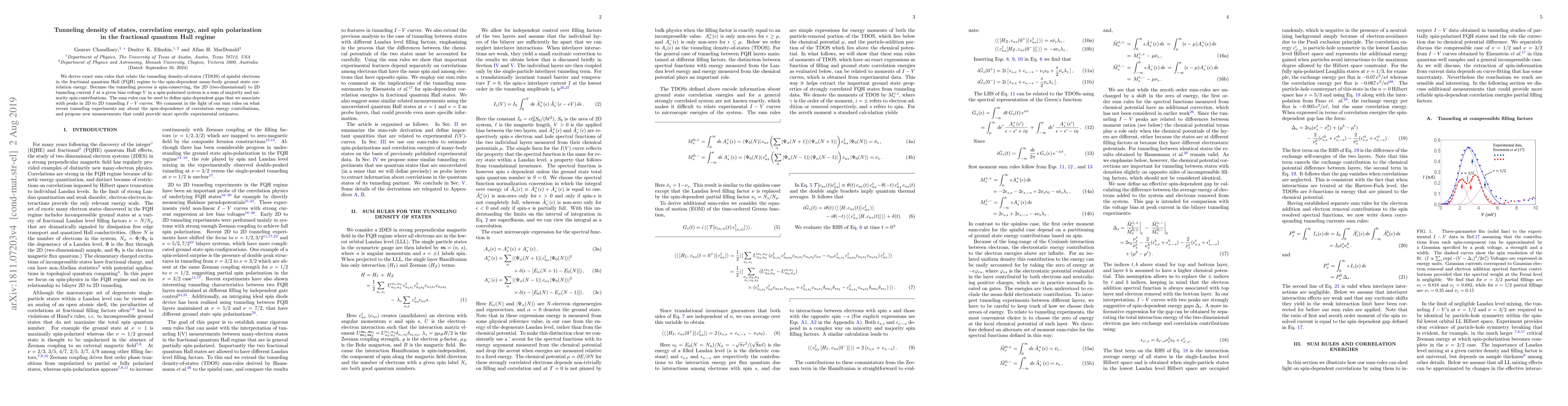 This paper derives exact sum-rules linking the tunneling density of states in the fractional quantum Hall regime to spin-dependent many-body ground state correlation energy. It proposes spin-dependent gaps associated with peaks in tunneling current-voltage curves and discusses potential experimental measurements to estimate these correlations.