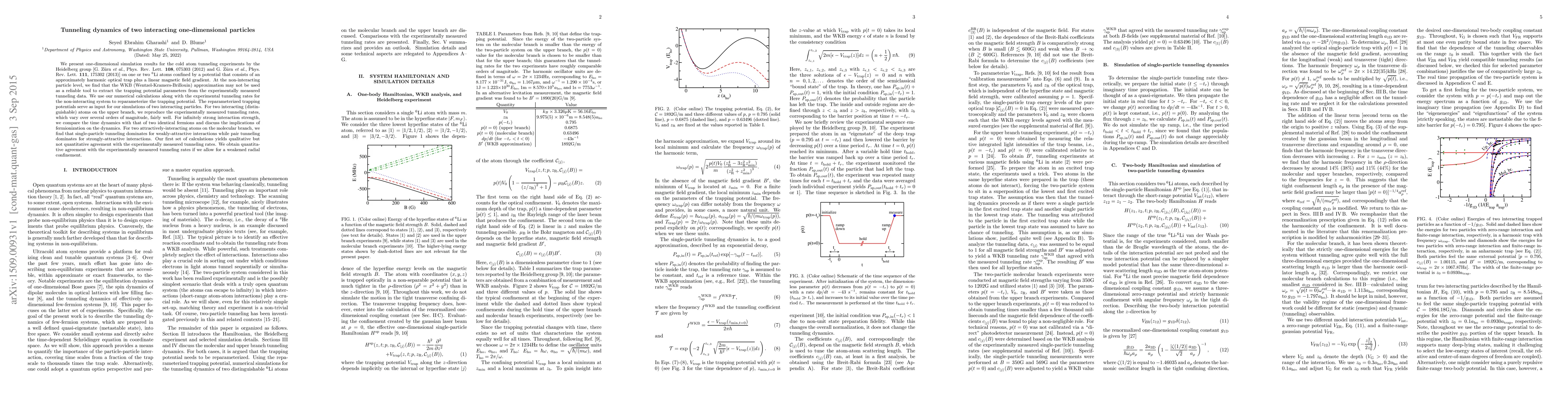 We present one-dimensional simulation results for the cold atom tunneling experiments by the Heidelberg group [G. Z\"urn {\em{et al.}}, Phys. Rev. Lett. {\bf{108}}, 075303 (2012) and G. Z\"urn {\em{et al.}}, Phys. Rev. Lett. {\bf{111}}, 175302 (2013)] on one or two $^6$Li atoms confined by a potential that consists of an approximately harmonic optical trap plus a linear magnetic field gradient. At the non-interacting particle level, we find that the WKB (Wentzel-Kramers-Brillouin) approximation may not be used as a reliable tool to extract the trapping potential parameters from the experimentally measured tunneling data. We use our numerical calculations along with the experimental tunneling rates for the non-interacting system to reparameterize the trapping potential. The reparameterized trapping potentials serve as input for our simulations of two interacting particles. For two interacting (distinguishable) atoms on the upper branch, we reproduce the experimentally measured tunneling rates, which vary over several orders of magnitude, fairly well. For infinitely strong interaction strength, we compare the time dynamics with that of two identical fermions and discuss the implications of fermionization on the dynamics. For two attractively-interacting atoms on the molecular branch, we find that single-particle tunneling dominates for weakly-attractive interactions while pair tunneling dominates for strongly-attractive interactions. Our first set of calculations yields qualitative but not quantitative agreement with the experimentally measured tunneling rates. We obtain quantitative agreement with the experimentally measured tunneling rates if we allow for a weakened radial confinement.