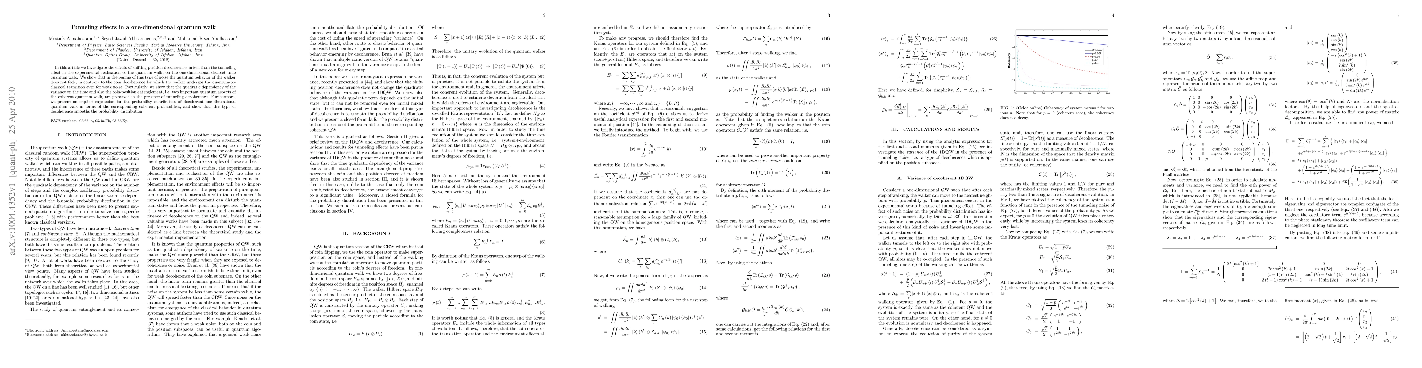 This paper examines how position decoherence due to tunneling effects in a one-dimensional quantum walk influences the quantum behavior, demonstrating that quantum characteristics like variance and entanglement remain intact despite decoherence. It also provides an expression for the probability distribution under this decoherence, showing it smooths the distribution.