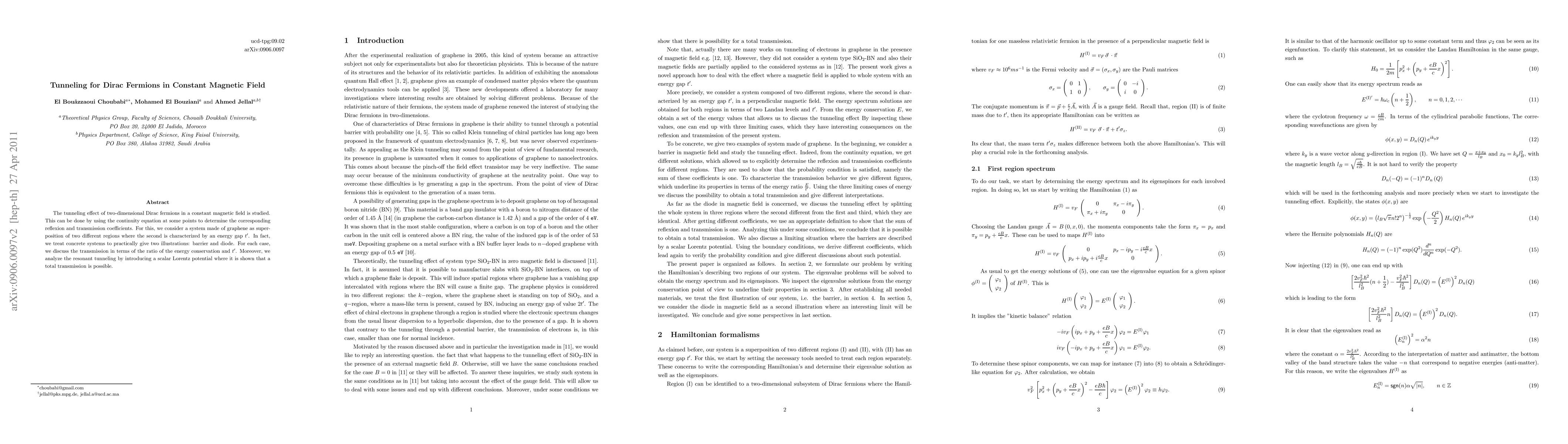 This research investigates the tunneling behavior of Dirac fermions in a magnetic field using graphene as a model system. It employs continuity equations to derive reflection and transmission coefficients, examining both barrier and diode configurations. The study highlights the influence of energy conservation and gap parameter 't' on transmission, and demonstrates the possibility of total transmission via resonant tunneling with a scalar Lorentz potential.