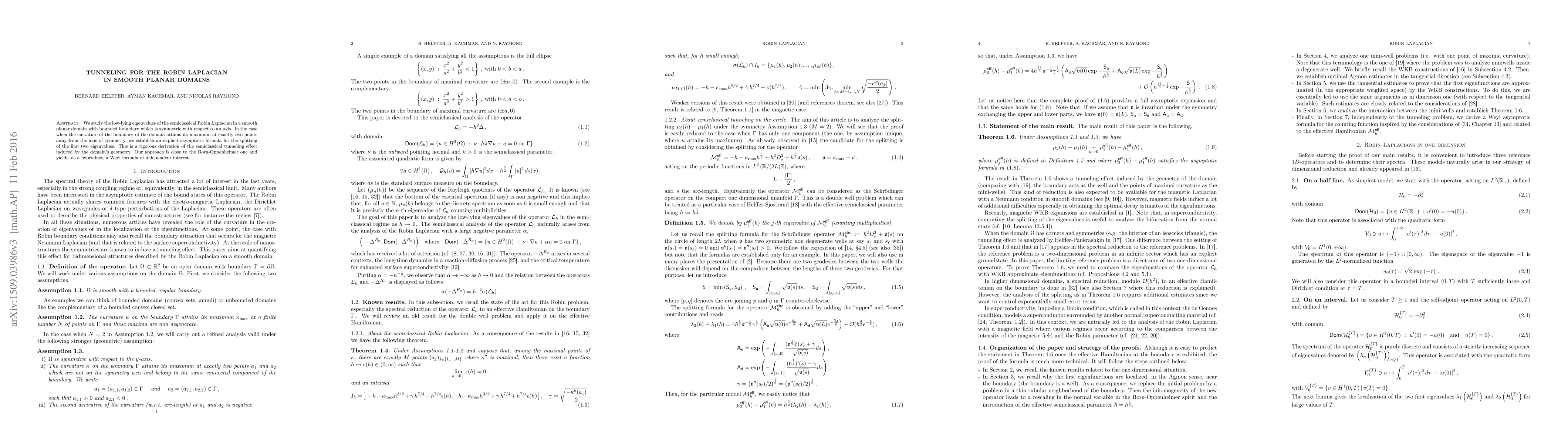 We study the low-lying eigenvalues of the semiclassical Robin Laplacian in a smooth planar domain symmetric with respect to an axis. In the case when the curvature of the boundary of the domain attains its maximum at exactly two points away from the axis of symmetry, we establish an explicit asymptotic formula for the splitting of the first two eigenvalues. This is a rigorous derivation of the semiclassical tunneling effect induced by the domain's geometry. Our approach is close to the Born-Oppenheimer one and yields, as a byproduct, a Weyl formula of independent interest.