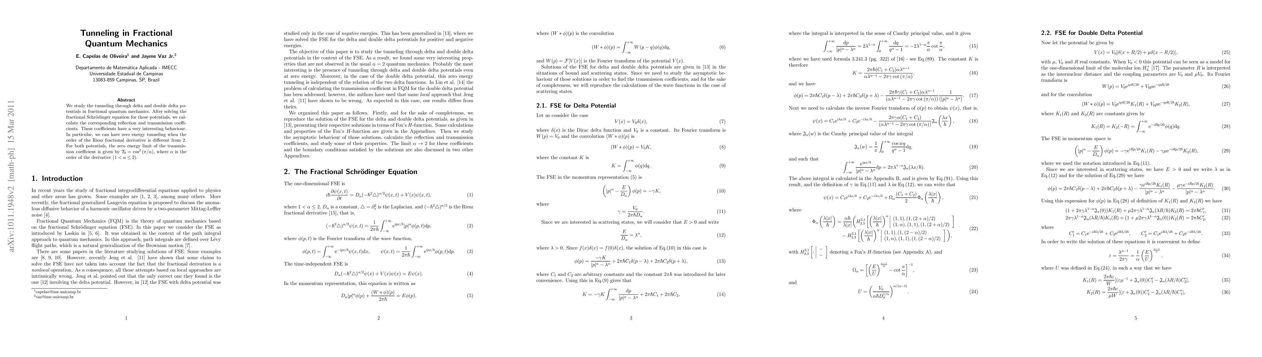This paper investigates tunneling phenomena in fractional quantum mechanics through delta and double delta potentials, revealing intriguing behaviors such as zero energy tunneling when the Riesz fractional derivative order differs from 2. The zero energy transmission coefficient is found to be $\mathcal{T}_0 = \cos^2{\pi/\alpha}$ for $1 < \alpha \leq 2$.