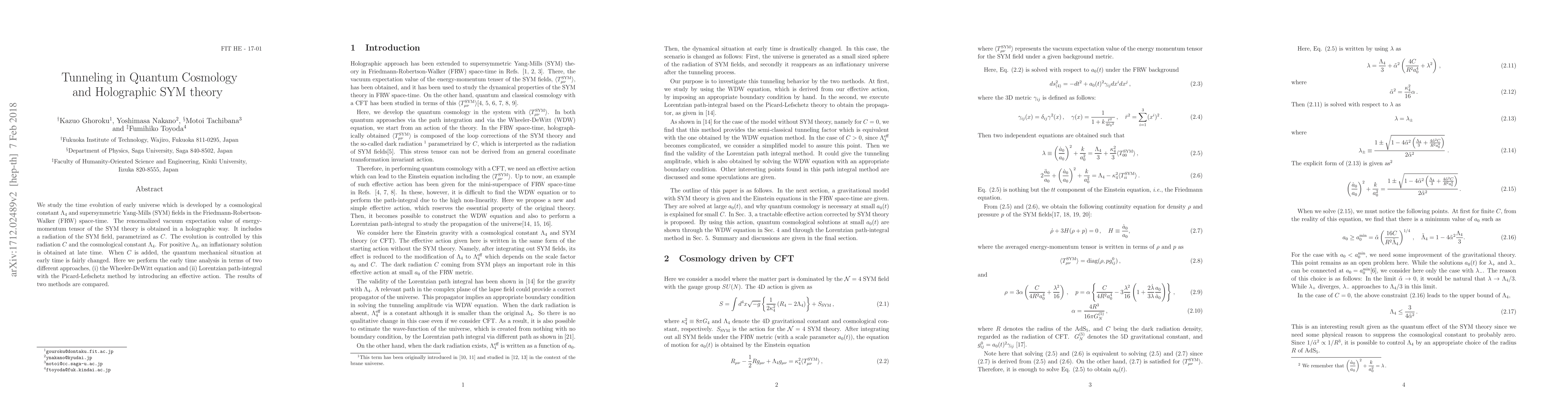 We study the time evolution of early universe which is developed by a cosmological constant $\Lambda_4$ and supersymmetric Yang-Mills (SYM) fields in the Friedmann-Robertson-Walker (FRW) space-time. The renormalized vacuum expectation value of energy-momentum tensor of the SYM theory is obtained in a holographic way. It includes a radiation of the SYM field, parametrized as $C$. The evolution is controlled by this radiation $C$ and the cosmological constant $\Lambda_4$. For positive $\Lambda_4$, an inflationary solution is obtained at late time. When $C$ is added, the quantum mechanical situation at early time is fairly changed. Here we perform the early time analysis in terms of two different approaches, (i) the Wheeler-DeWitt equation and (ii) Lorentzian path-integral with the Picard-Lefschetz method by introducing an effective action. The results of two methods are compared.