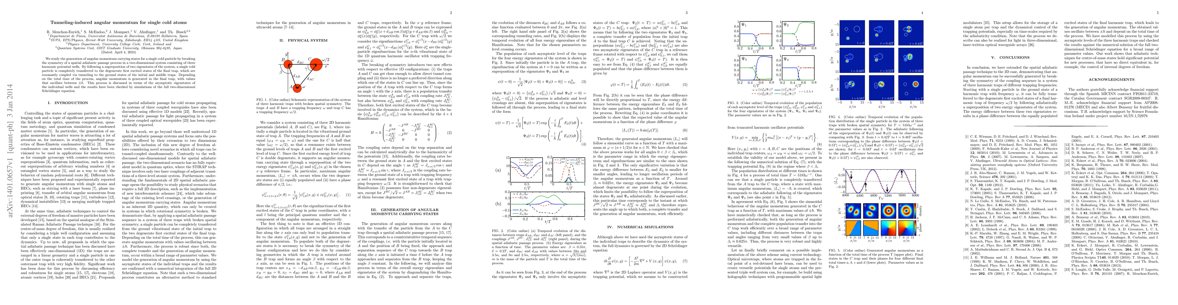 We study the generation of angular momentum carrying states for a single cold particle by breaking the symmetry of a spatial adiabatic passage process in a two-dimensional system consisting of three harmonic potential wells. By following a superposition of two eigenstates of the system, a single cold particle is completely transferred to the degenerate first excited states of the final trap, which are resonantly coupled via tunneling to the ground states of the initial and middle traps. Depending on the total time of the process, angular momentum is generated in the final trap, with values that oscillate between $\pm\hbar$. This process is discussed in terms of the asymptotic eigenstates of the individual wells and the results have been checked by simulations of the full two-dimensional Schr\"odinger equation.