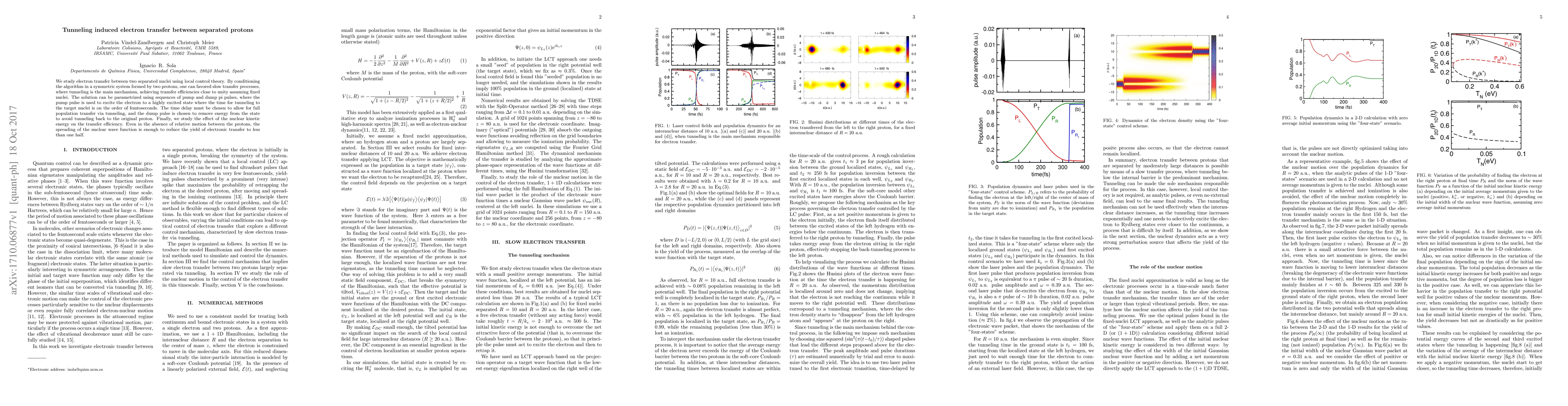 This paper explores electron transfer via tunneling between two separated protons using local control theory, achieving near-unity transfer efficiencies through carefully timed pump and dump pi pulses. It finds that even static protons experience reduced transfer efficiency due to nuclear kinetic energy effects.