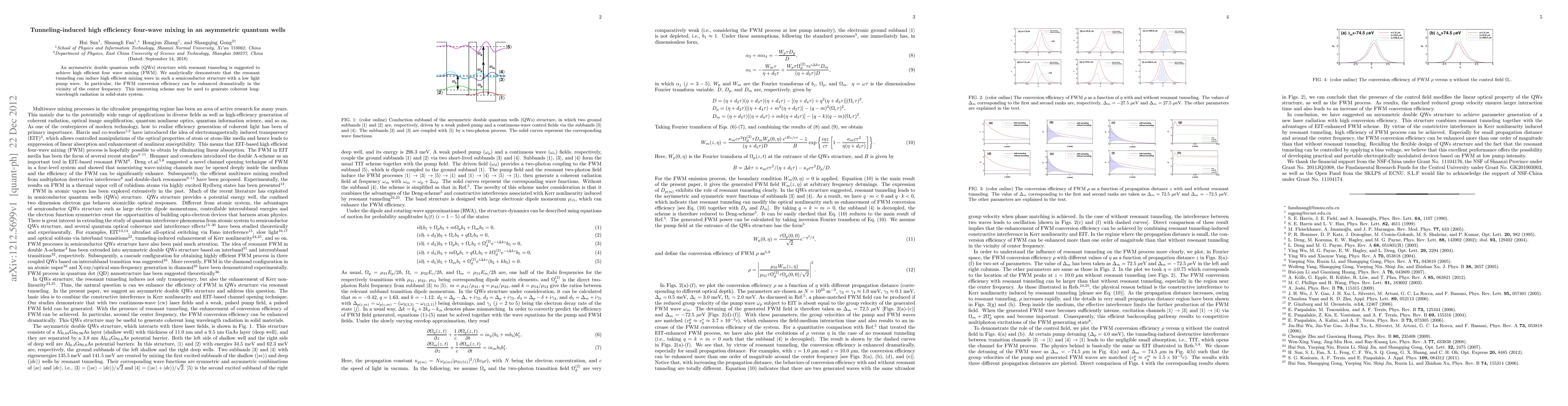 An asymmetric double quantum wells (QWs) structure with resonant tunneling is suggested to achieve high efficient four wave mixing (FWM). We analytically demonstrate that the resonant tunneling can induce high efficient mixing wave in such a semiconductor structure with a low light pump wave. In particular, the FWM conversion efficiency can be enhanced dramatically in the vicinity of the center frequency. This interesting scheme may be used to generate coherent long-wavelength radiation in solid-state system.