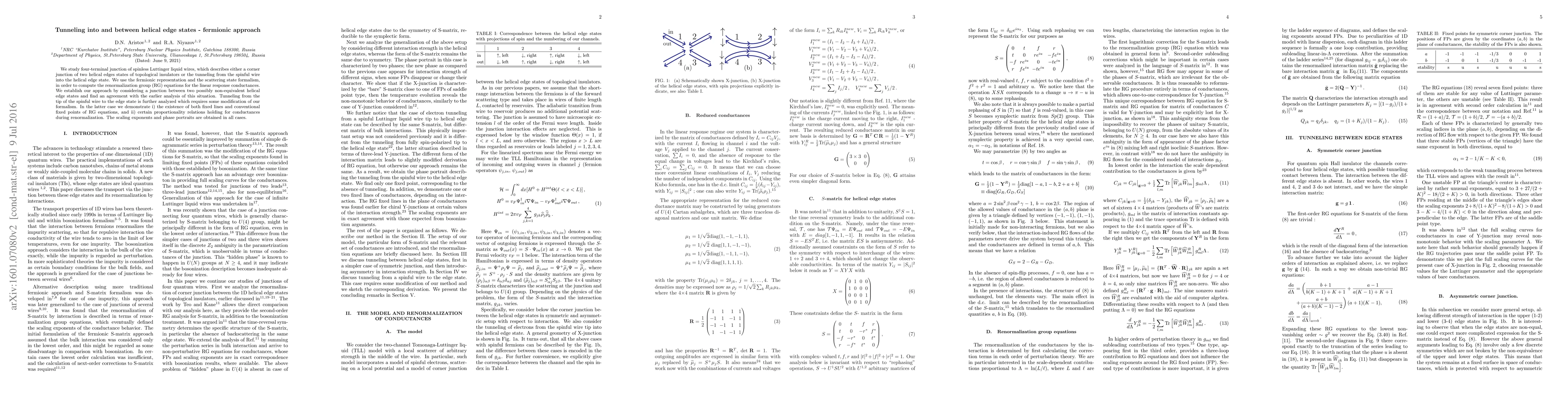 This paper investigates the four-terminal junction of spinless Luttinger liquid wires using fermionic representation and scattering state formalism to compute RG equations for linear response conductances. It demonstrates the existence of fixed lines and conventional fixed points in tunneling from spinful wires to helical edge states, establishing proportionality relations and obtaining scaling exponents and phase portraits.