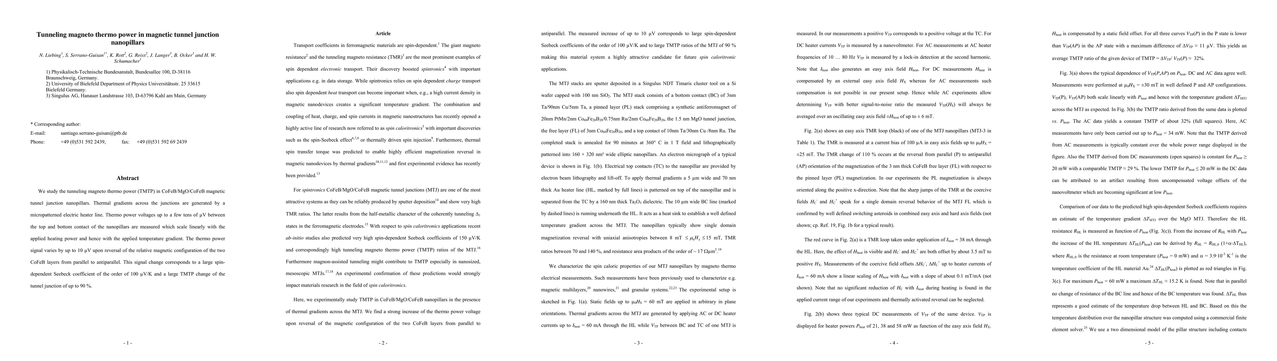 We study the tunneling magneto thermo power (TMTP) in CoFeB/MgO/CoFeB magnetic tunnel junction nanopillars. Thermal gradients across the junctions are generated by a micropatterned electric heater line. Thermo power voltages up to a few tens of \muV between the top and bottom contact of the nanopillars are measured which scale linearly with the applied heating power and hence with the applied temperature gradient. The thermo power signal varies by up to 10 \muV upon reversal of the relative magnetic configuration of the two CoFeB layers from parallel to antiparallel. This signal change corresponds to a large spin-dependent Seebeck coefficient of the order of 100 \muV/K and a large TMTP change of the tunnel junction of up to 90%.