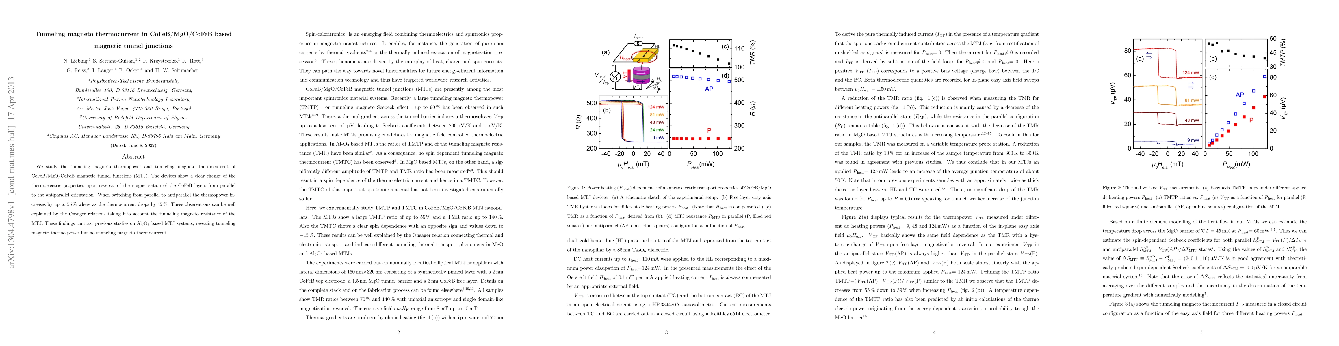 This work distinguishes itself by observing both tunneling magneto thermopower and thermocurrent in CoFeB/MgO/CoFeB MTJs, contrasting with previous studies on AlO-based systems that only reported thermopower.