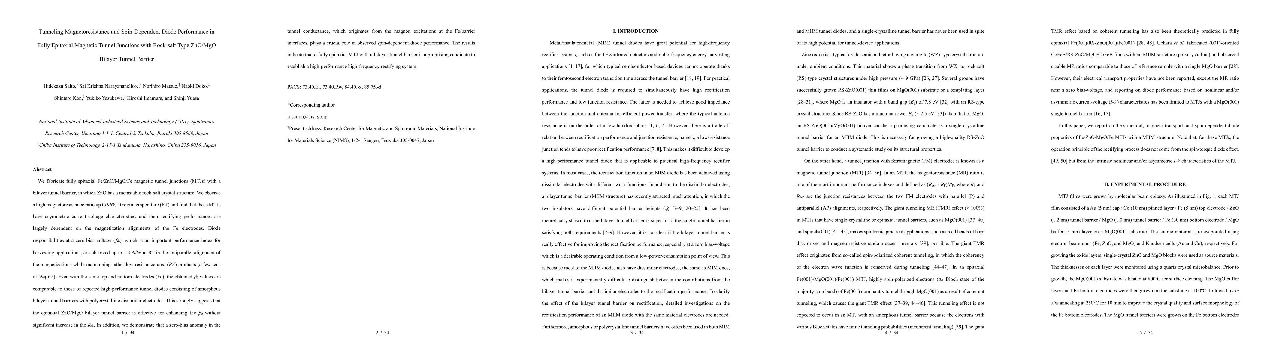 This paper reports on the fabrication of fully epitaxial Fe/ZnO/MgO/Fe magnetic tunnel junctions with a rock-salt type ZnO/MgO bilayer tunnel barrier, achieving high tunneling magnetoresistance up to 96% at room temperature and demonstrating spin-dependent diode performance with a zero-bias diode responsibility up to 1.3 A/W. The study highlights the effectiveness of the epitaxial ZnO/MgO bilayer in enhancing diode performance without significantly increasing resistance-area products.