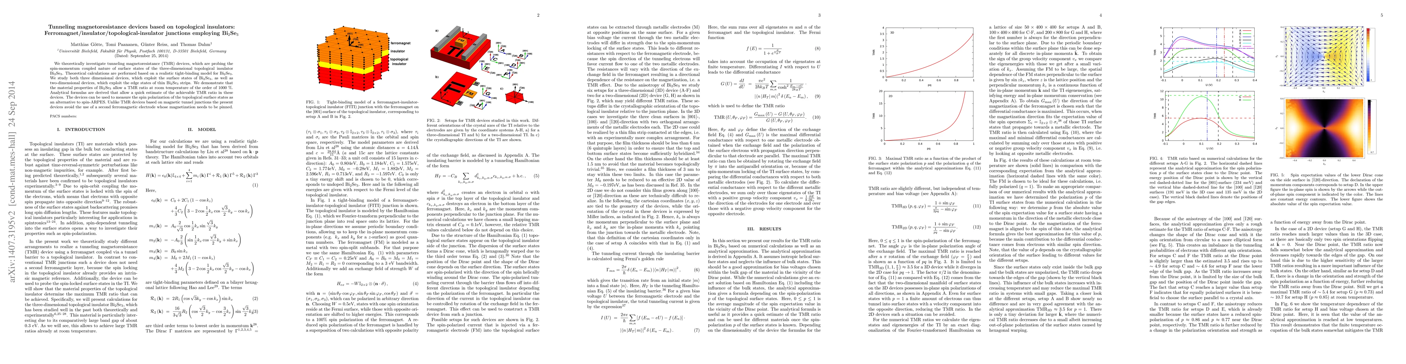 We theoretically investigate tunneling magnetoresistance (TMR) devices, which are probing the spin-momentum coupled nature of surface states of the three-dimensional topological insulator Bi$_{2}$Se$_{3}$. Theoretical calculations are performed based on a realistic tight-binding model for Bi$_{2}$Se$_{3}$. We study both three dimensional devices, which exploit the surface states of Bi$_{2}$Se$_{3}$, as well as two-dimensional devices, which exploit the edge states of thin Bi$_{2}$Se$_{3}$ strips. We demonstrate that the material properties of Bi$_{2}$Se$_{3}$ allow a TMR ratio at room temperature of the order of 1000%. Analytical formulas are derived that allow a quick estimate of the achievable TMR ratio in these devices. The devices can be used to measure the spin polarization of the topological surface states as an alternative to spin-ARPES. Unlike TMR devices based on magnetic tunnel junctions the present devices avoid the use of a second ferromagnetic electrode whose magnetization needs to be pinned.
