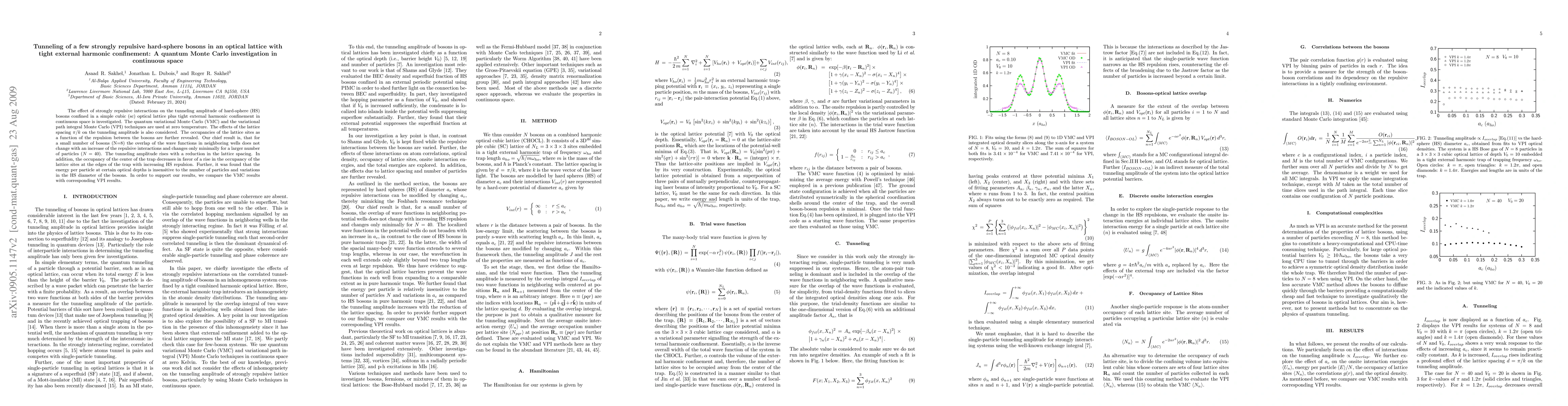 The effect of strongly repulsive interactions on the tunneling amplitude of hard-sphere (HS) bosons confined in a simple cubic (sc) optical lattice plus tight external harmonic confinement in continuous space is investigated. The quantum variational Monte Carlo (VMC) and the variational path integral Monte Carlo (VPI) techniques are used at zero temperature. The effects of the lattice spacing $\pi/k$ on the tunneling amplitude is also considered. The occupancies of the lattice sites as a function of the repulsion between the bosons are further revealed. Our chief result is, that for a small number of bosons (N=8) the overlap of the wave functions in neighboring wells does not change with an increase of the repulsive interactions and changes only minimally for a larger number of particles (N=40). The tunneling amplitude rises with a reduction in the lattice spacing. In addition, the occupancy of the center of the trap decreases in favor of a rise in the occupancy of the lattice sites at the edges of the trap with increasing HS repulsion. Further, it was found that the energy per particle at certain optical depths is insensitive to the number of particles and variations in the HS diameter of the bosons. In order to support our results, we compare the VMC results with corresponding VPI results.