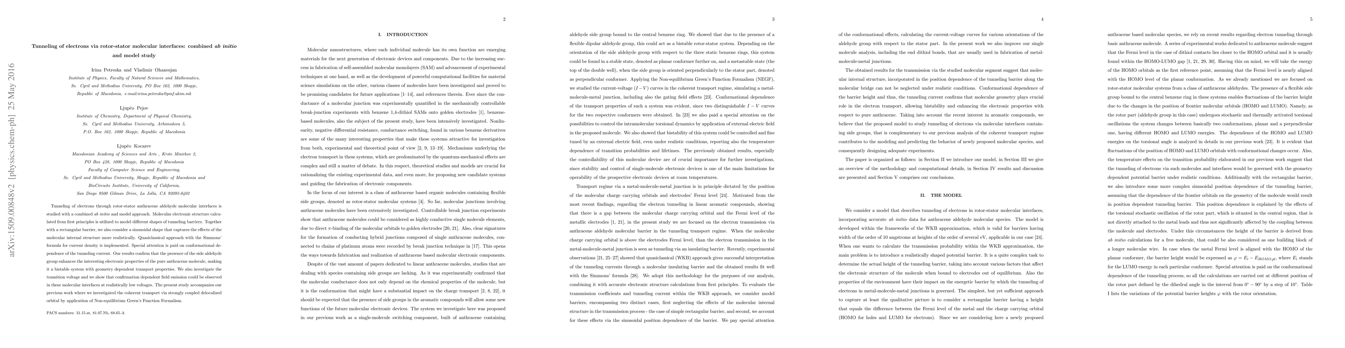 Tunneling of electrons through rotor-stator anthracene aldehyde molecular interfaces is studied with a combined ab initio and model approach. Molecular electronic structure calculated from first principles is utilized to model different shapes of tunneling barriers. Together with a rectangular barrier, we also consider a sinusoidal shape that captures the effects of the molecular internal structure more realistically. Quasiclassical approach with the Simmons' formula for current density is implemented. Special attention is paid on conformational dependence of the tunneling current. Our results confirm that the presence of the side aldehyde group enhances the interesting electronic properties of the pure anthracene molecule, making it a bistable system with geometry dependent transport properties. We also investigate the transition voltage and we show that confirmation dependent field emission could be observed in these molecular interfaces at realistically low voltages. The present study accompanies our previous work where we investigated the coherent transport via strongly coupled delocalized orbital by application of Non-equilibrium Green's Function Formalism.