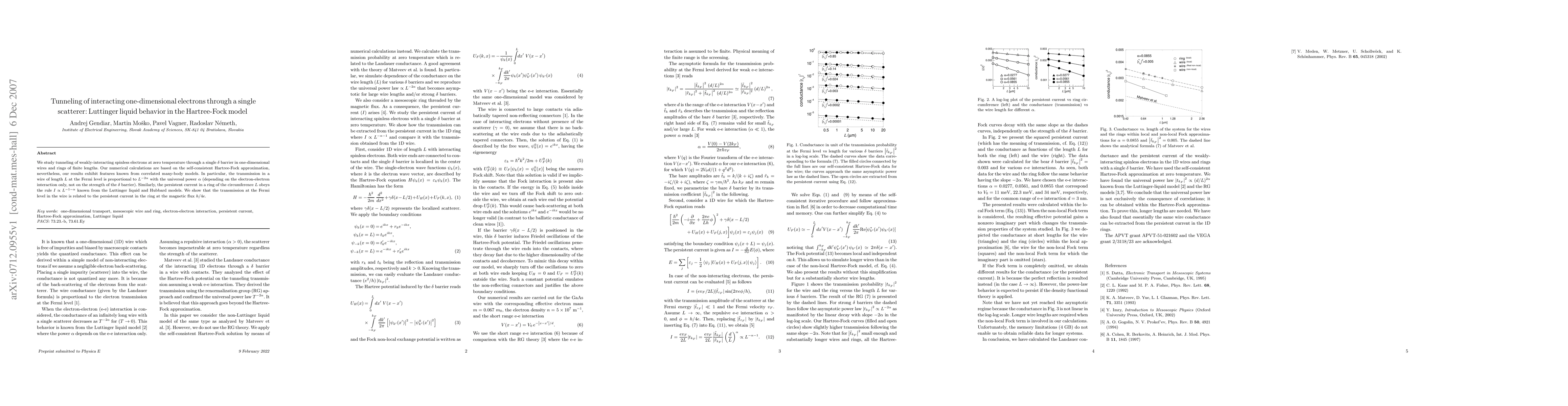 We study tunneling of weakly-interacting spinless electrons at zero temperature through a single delta-barrier in one-dimensional wires and rings of finite lengths. Our numerical calculations are based on the self-consistent Hartree-Fock approximation, nevertheless, our results exhibit features known from correlated many-body models. In particular, the transmission in a wire of length L at the Fermi level is proportional to $L^{-2\alpha}$ with the universal power $\alpha$ (depending on the electron-electron interaction only, not on the strength of the delta-barrier). Similarly, the persistent current in a ring of the circumference $L$ obeys the rule $I\propto L^{-1-\alpha}$ known from the Luttinger liquid and Hubbard models. We show that the transmission at the Fermi level in the wire is related to the persistent current in the ring at the magnetic flux h/4e.