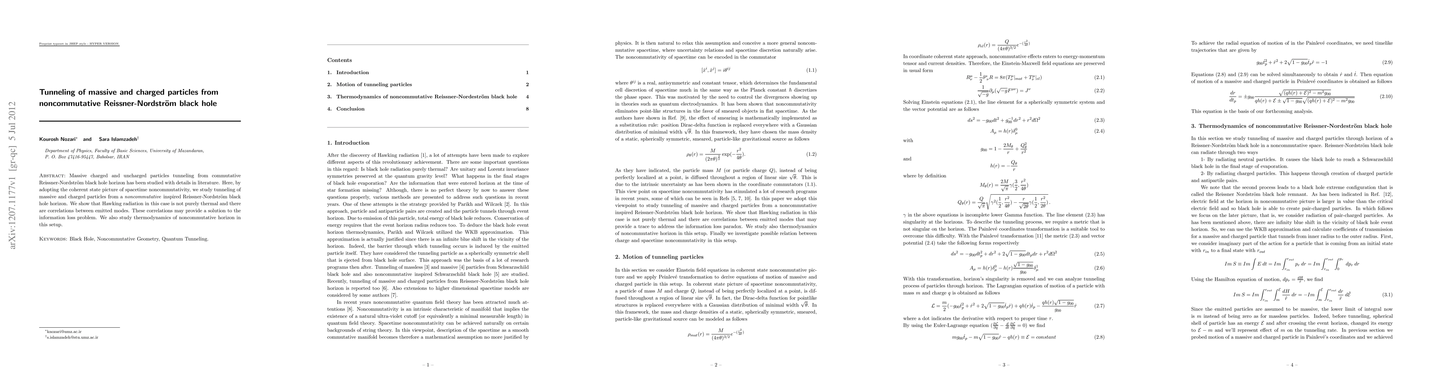 This paper investigates the tunneling of massive and charged particles from a noncommutative Reissner-Nordström black hole horizon, revealing that the Hawking radiation is non-thermal and exhibits correlations between emitted modes, potentially addressing the information loss paradox. Additionally, the study explores the thermodynamics of the noncommutative horizon.