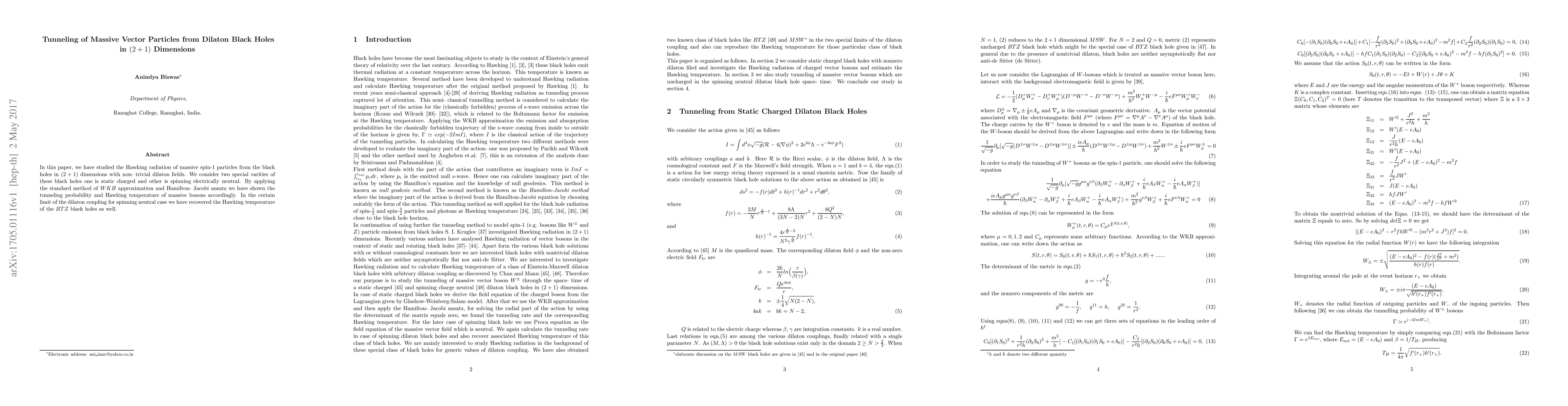 This paper investigates the Hawking radiation of massive spin-1 particles from $(2+1)$-dimensional dilaton black holes, showing tunneling probabilities and Hawking temperatures using the WKB approximation. It recovers the Hawking temperature of BTZ black holes under specific dilaton coupling conditions.