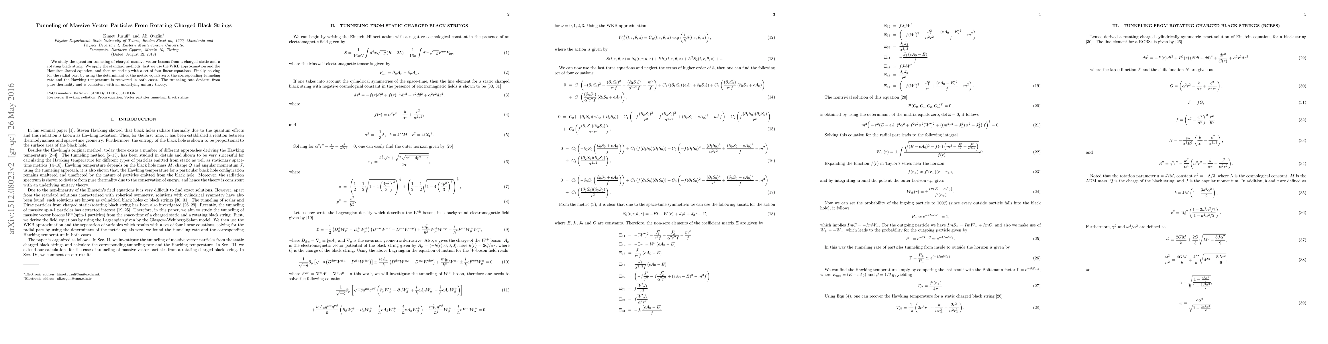 We study the quantum tunneling of charged massive vector bosons from a charged static and a rotating black string. We apply the standard methods, first we use the WKB approximation and the Hamilton-Jacobi equation, and then we end up with a set of four linear equations. Finally, solving for the radial part by using the determinant of the metric equals zero, the corresponding tunneling rate and the Hawking temperature is recovered in both cases. The tunneling rate deviates from pure thermality and is consistent with an underlying unitary theory.