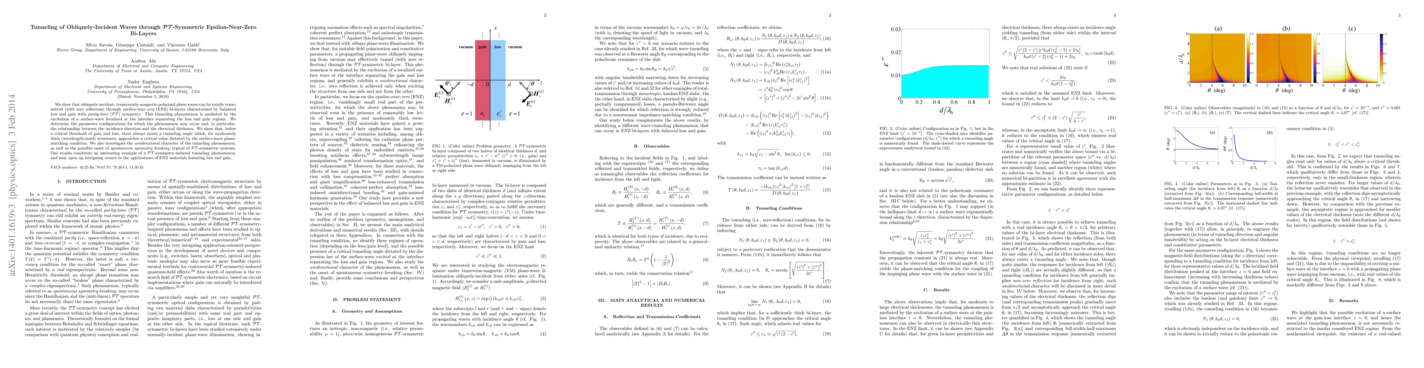 This paper demonstrates that obliquely-incident transversely-magnetic-polarized waves can tunnel through epsilon-near-zero bi-layers with PT symmetry, achieving total transmission with zero reflection due to surface-wave excitation. The study identifies conditions for this phenomenon and explores its unidirectional nature and potential symmetry breaking.