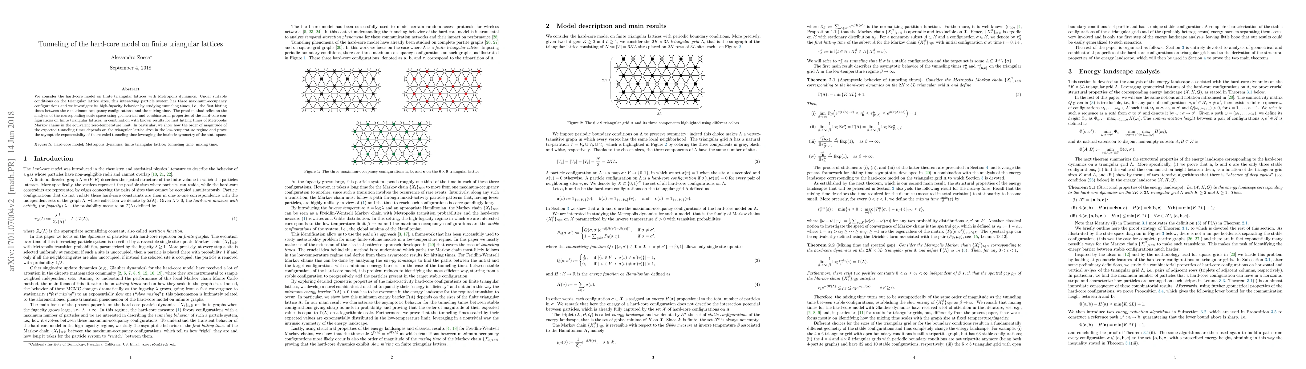 This paper investigates the tunneling times between maximum-occupancy configurations in the hard-core model on finite triangular lattices using Metropolis dynamics. It demonstrates the dependence of expected tunneling times on lattice dimensions and proves the asymptotic exponentiality of the rescaled tunneling time, leveraging geometric and combinatorial properties.