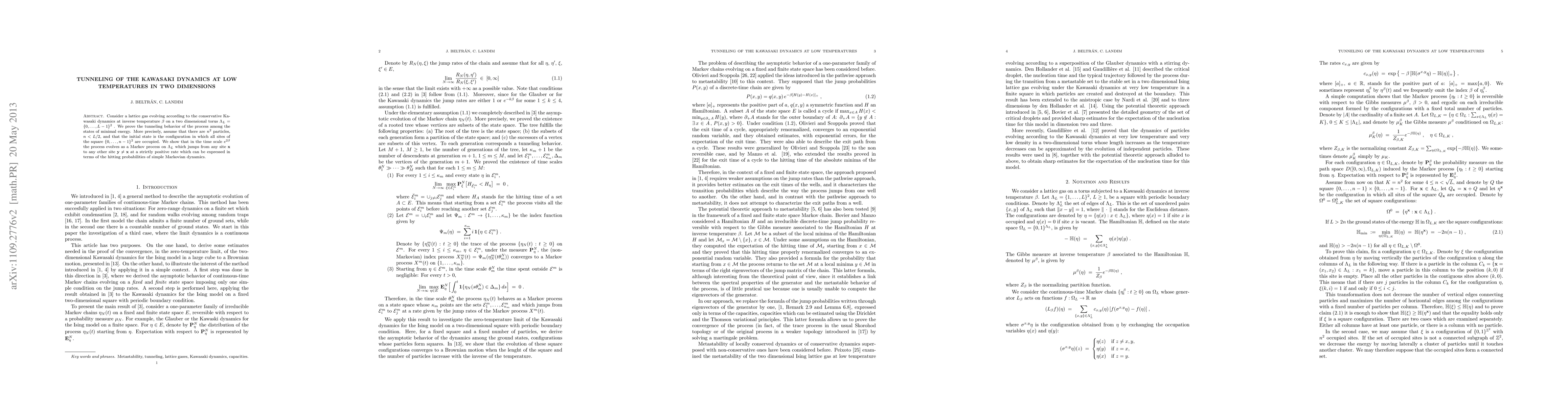 Consider a lattice gas evolving according to the conservative Kawasaki dynamics at inverse temperature $\beta$ on a two dimensional torus $\Lambda_L=\{0,..., L-1\}^2$ . We prove the tunneling behavior of the process among the states of minimal energy. More precisely, assume that there are $n^2\ll L$ particles and that the initial state is the configuration in which all sites of the square $\mb x + \{0,..., n-1\}^2$ are occupied. We show that in the time scale $e^{2\beta}$ the process is close to a Markov process on $\Lambda_L$ which jumps from any site $\mb x$ to any other site $\mb y\not =\mb x$ at a strictly positive rate which can be expressed in terms of the jump rates of simple random walks.