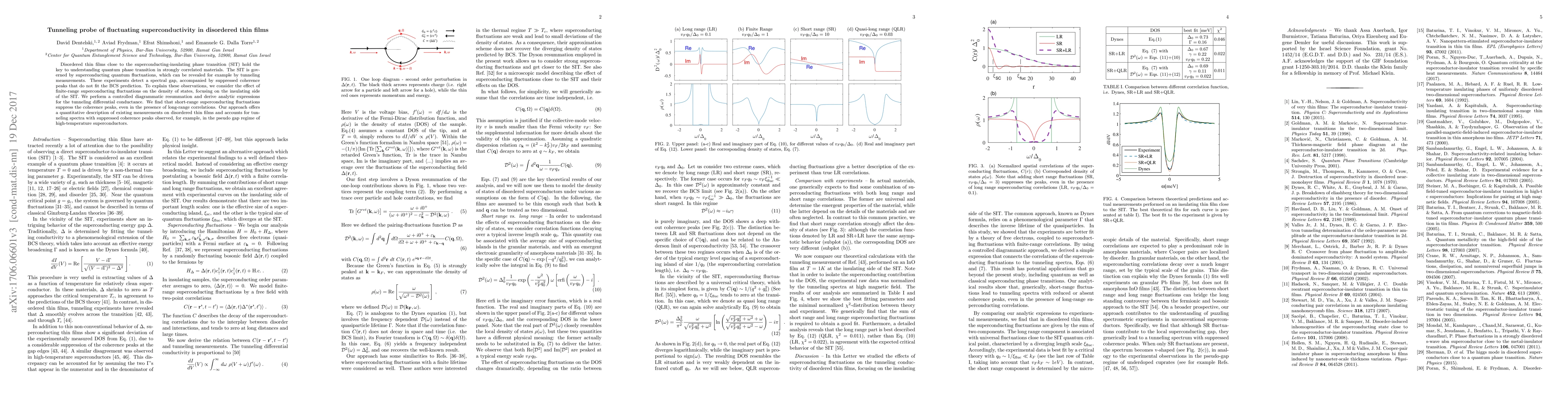 This paper investigates superconducting quantum fluctuations in disordered thin films near the superconducting-insulating phase transition using tunneling measurements. The study reveals that short-range fluctuations suppress coherence peaks in tunneling spectra, providing a quantitative explanation for observations in high-temperature superconductors.