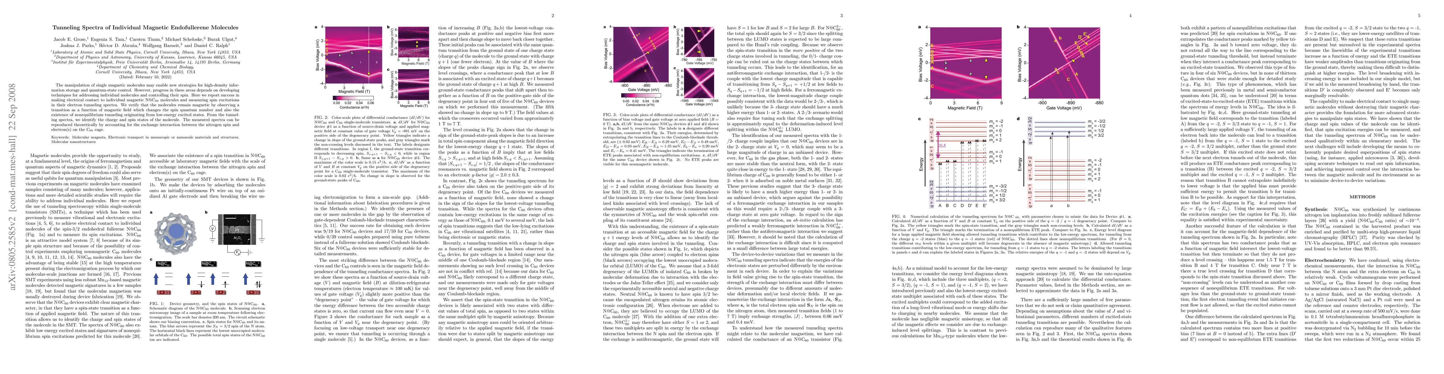 This paper reports successful electrical contact to individual magnetic N@C60 molecules, demonstrating spin excitations in their tunneling spectra and verifying their magnetic properties through field-dependent transitions and nonequilibrium tunneling. The study identifies the charge and spin states of the molecules, with theoretical models confirming the exchange interaction between the nitrogen spin and C60 cage electrons.