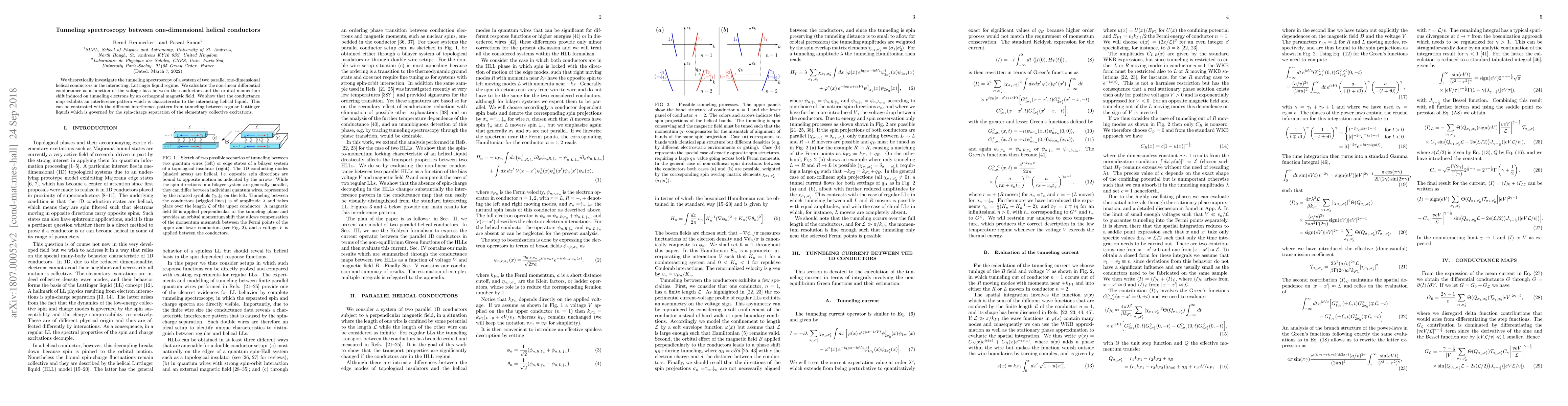 We theoretically investigate the tunneling spectroscopy of a system of two parallel one-dimensional helical conductors in the interacting, Luttinger liquid regime. We calculate the non-linear differential conductance as a function of the voltage bias between the conductors and the orbital momentum shift induced on tunneling electrons by an orthogonal magnetic field. We show that the conductance map exhibits an interference pattern which is characteristic to the interacting helical liquid. This can be contrasted with the different interference pattern from tunneling between regular Luttinger liquids which is governed by the spin-charge separation of the elementary collective excitations.