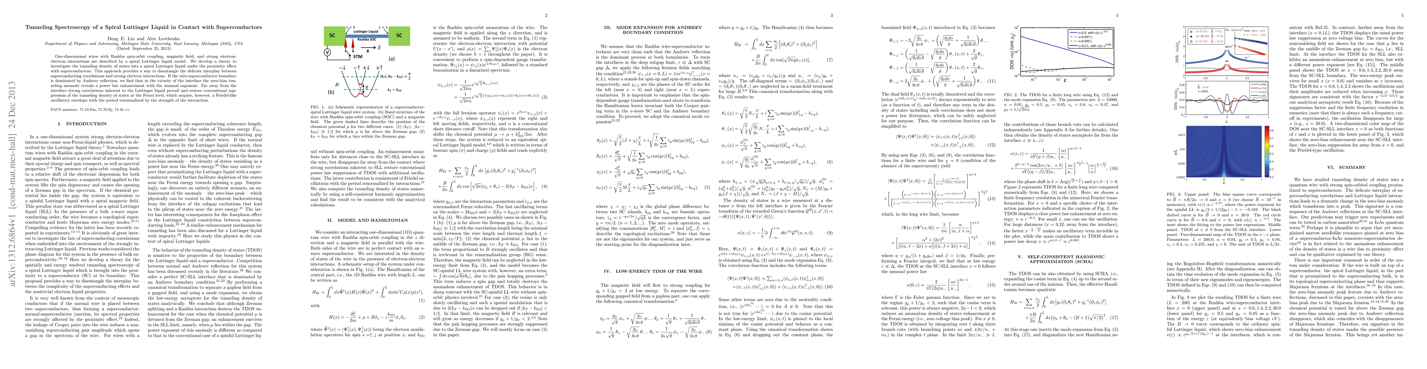 This paper develops a theoretical framework to study tunneling spectroscopy in a spiral Luttinger liquid influenced by proximity to superconductors, revealing a power law enhancement near the interface due to Andreev reflection and Friedel-like oscillations far from the interface.
