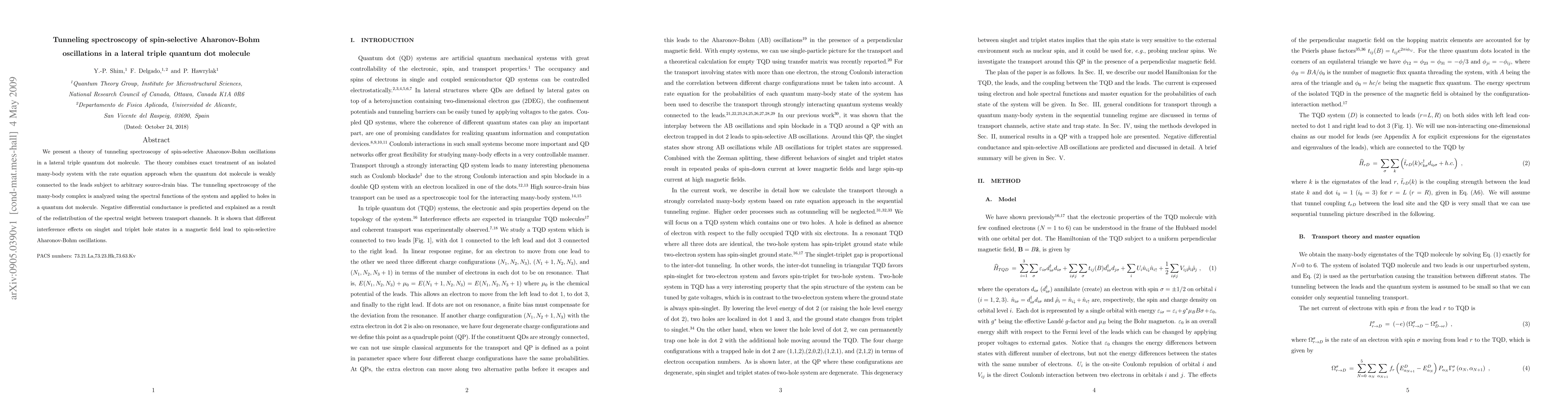 This paper develops a theoretical framework for tunneling spectroscopy of spin-selective Aharonov-Bohm oscillations in a lateral triple quantum dot molecule, combining exact many-body treatment with rate equation approaches for weak connections to leads. It predicts negative differential conductance due to spectral weight redistribution and demonstrates spin-selective oscillations in magnetic fields.