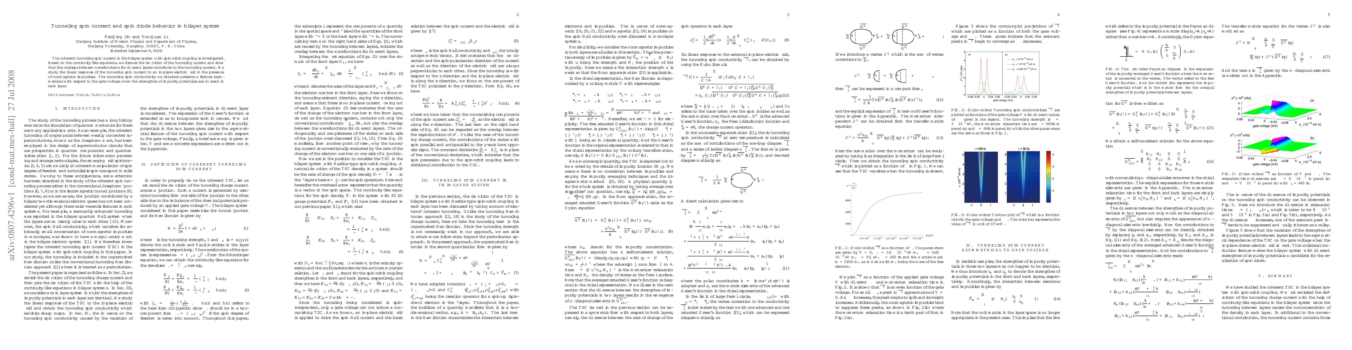 This paper investigates the coherent tunneling spin current in a bilayer system with spin-orbit coupling, demonstrating that wavefunction overlaps contribute to the current. It finds that the tunneling spin conductivity exhibits asymmetric behavior with respect to gate voltage under varying impurity potential strengths in each layer, indicating spin diode behavior.