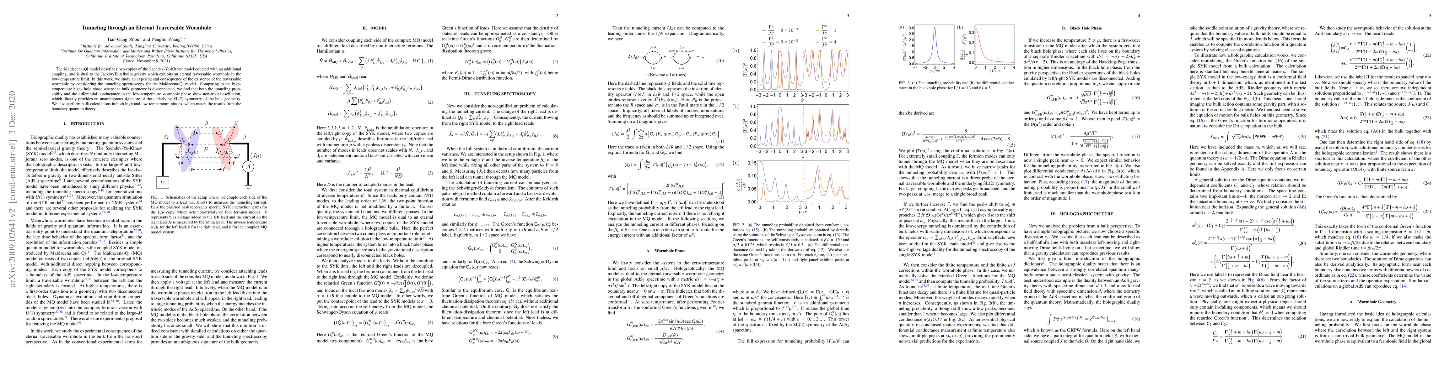 The Maldacena-Qi model describes two copies of the Sachdev-Ye-Kitaev model coupled with an additional coupling, and is dual to the Jackiw-Teitelboim gravity which exhibits an eternal traversable wormhole in the low-temperature limit. In this work, we study an experimental consequence of the existence of the traversable wormhole by considering the tunneling spectroscopy for the Maldacena-Qi model. Comparing to the high-temperature black hole phase where the bulk geometry is disconnected, we find that both the tunneling probability and the differential conductance in the low-temperature wormhole phase show non-trivial oscillation, which directly provides an unambiguous signature of the underlying $\operatorname{SL}(2)$ symmetry of the bulk geometry. We also perform bulk calculations in both high and low-temperature phases, which match the results from the boundary quantum theory.