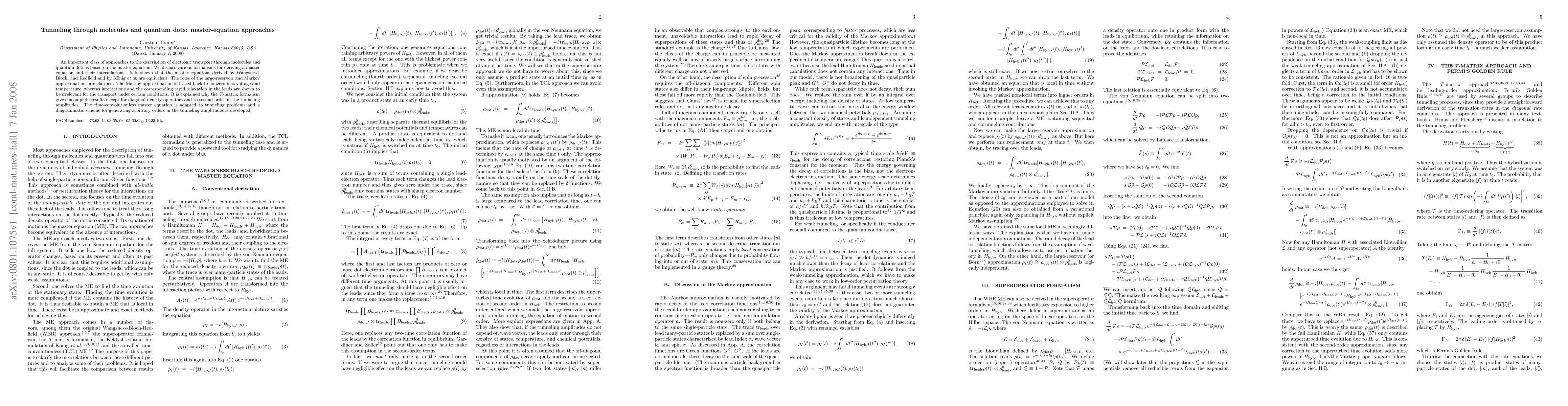 This paper discusses various master-equation approaches to electronic transport in molecules and quantum dots, showing equivalence among different formalisms and clarifying the roles of approximations like the Markov approximation. It also develops a diagrammatic scheme for generating higher-order tunneling amplitudes.