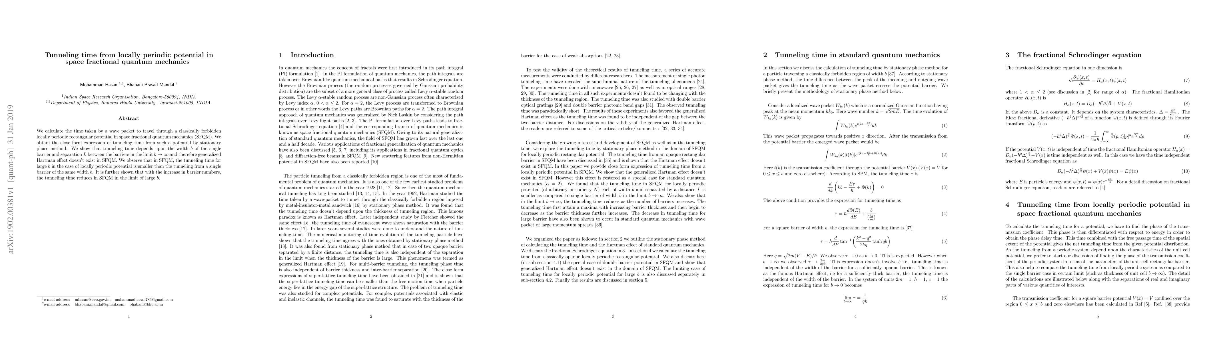 This paper calculates the tunneling time for a wave packet through a classically forbidden locally periodic potential in space fractional quantum mechanics, finding that tunneling time depends on the barrier width and separation, and that the generalized Hartman effect does not exist in this framework. It concludes that the tunneling time is smaller for multiple barriers compared to a single barrier of the same width.