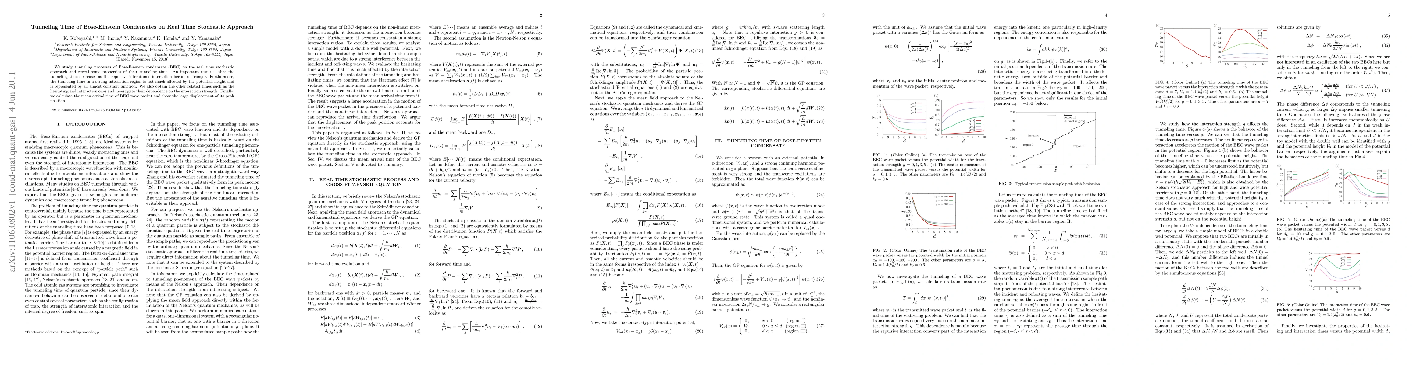 We study tunneling processes of Bose-Einstein condensate (BEC) on the real time stochastic approach and reveal some properties of their tunneling time. An important result is that the tunneling time decreases as the repulsive interatomic interaction becomes stronger. Furthermore, the tunneling time in a strong interaction region is not much affected by the potential height and is represented by an almost constant function. We also obtain the other related times such as the hesitating and interaction ones and investigate their dependence on the interaction strength. Finally, we calculate the mean arrival time of BEC wave packet and show the large displacement of its peak position.