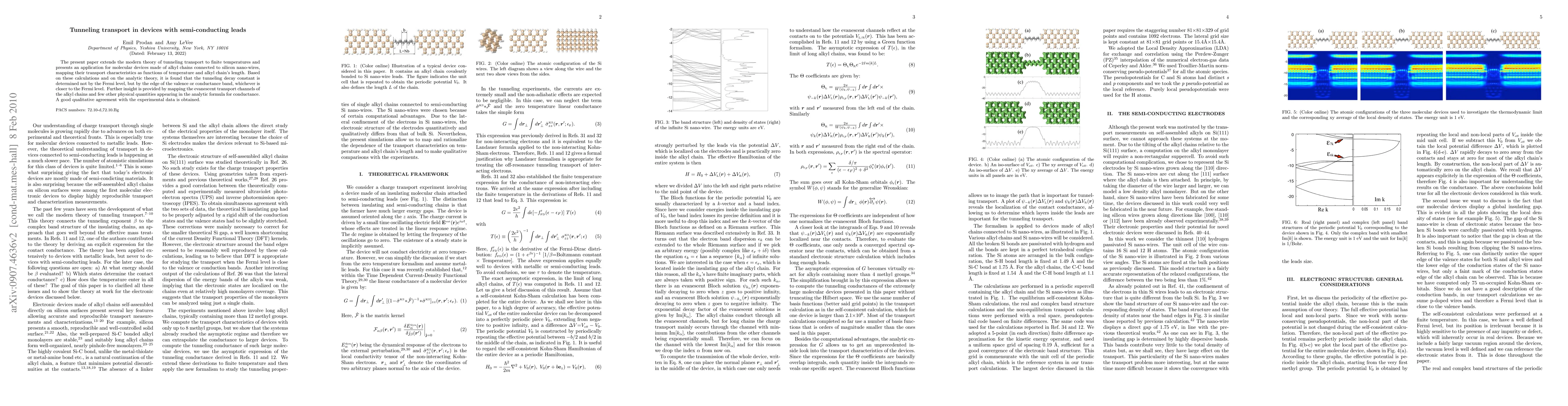 This paper extends the modern theory of tunneling transport to finite temperatures. The extension enables applications to molecular electronic devices connected to semiconducting leads. The paper presents an application of the theory to molecular devices made of alkyl chains connected to silicon nano-wires, mapping their transport characteristics as functions of temperature and alkyl chain's length. Based on these calculations and on the analytic theory, it is found that the tunneling decay constant is determined not by the Fermi level, but by the edge of the valence or conductance band, whichever is closer to the Fermi level. Further insight is provided by mapping the evanescent transport channels of the alkyl chains and few other physical quantities appearing in the analytic formula for conductance. A good qualitative agreement with the experimental data is obtained.