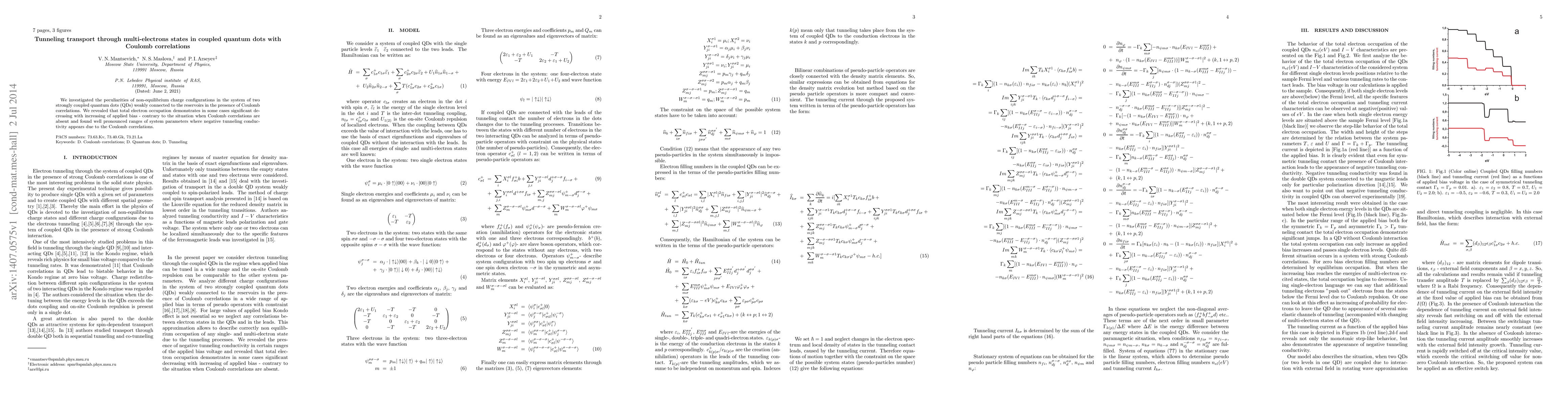 Summary: This study explores non-equilibrium charge configurations in coupled quantum dots with Coulomb correlations, revealing a significant decrease in total electron occupation with increasing bias, and identifying parameter ranges where negative tunneling conductivity emerges due to these correlations.