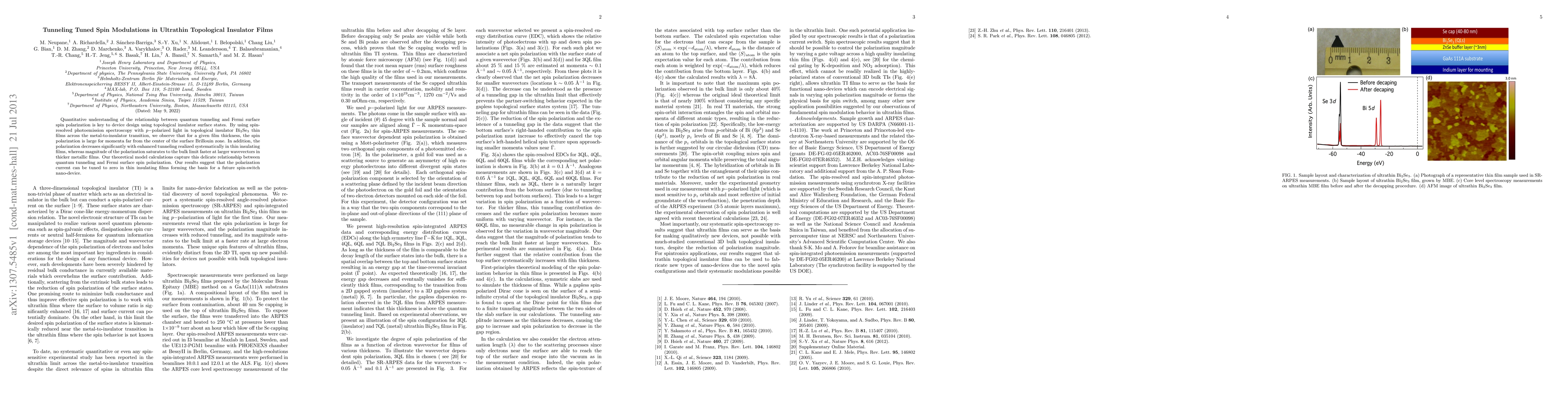 This paper investigates the interplay between quantum tunneling and Fermi surface spin polarization in topological insulator Bi2Se3 thin films using spin-resolved photoemission spectroscopy. The study reveals that spin polarization is significant at certain momentum values and diminishes with increased tunneling, suggesting potential for tuning polarization to zero in thin insulating films, paving the way for spin-switch nano-devices.