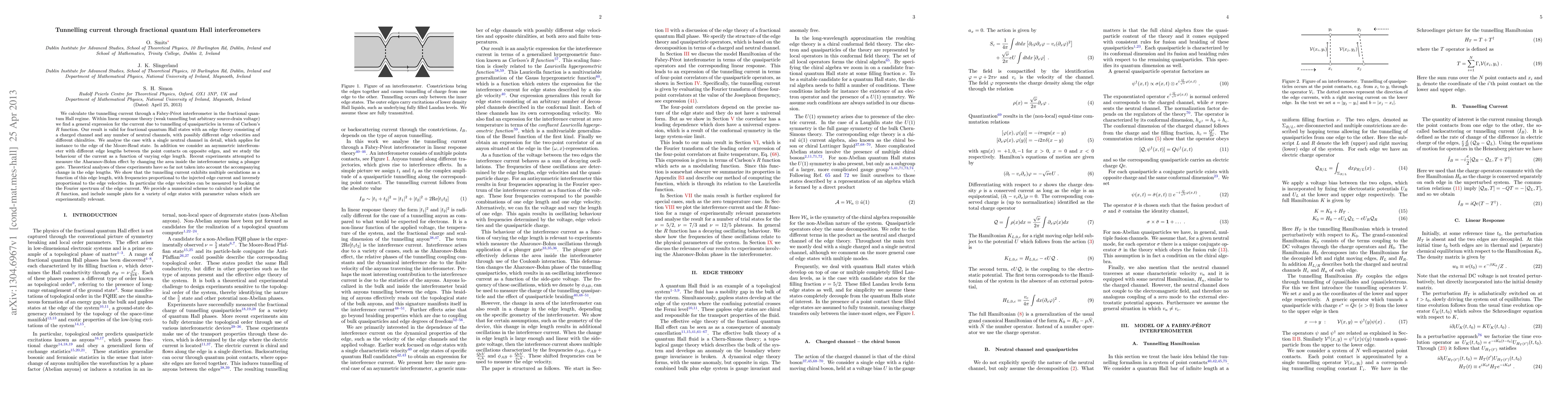 This paper calculates the tunnelling current through a Fabry-Pérot interferometer in the fractional quantum Hall regime, deriving a general expression for current in terms of Carlson's $R$ function. It also explores the impact of varying edge lengths on the tunnelling current, showing that edge velocities can be measured from the Fourier spectrum of the edge current.