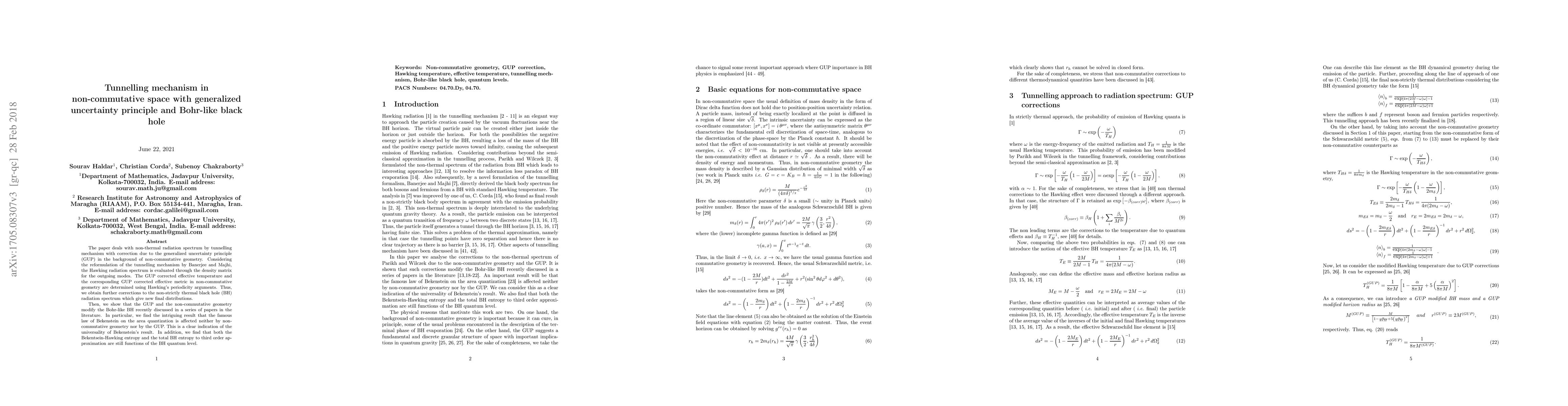 The paper deals with non-thermal radiation spectrum by tunnelling mechanism with correction due to the generalized uncertainty principle (GUP) in the background of non-commutative geometry. Considering the reformulation of the tunnelling mechanism by Banerjee and Majhi, the Hawking radiation spectrum is evaluated through the density matrix for the outgoing modes. The GUP corrected effective temperature and the corresponding GUP corrected effective metric in non-commutative geometry are determined using Hawking's periodicity arguments. Thus, we obtain further corrections to the non-strictly thermal black hole (BH) radiation spectrum which give new final distributions. Then, we show that the GUP and the non-commutative geometry modify the Bohr-like BH recently discussed in a series of papers in the literature. In particular, we find the intriguing result that the famous law of Bekenstein on the area quantization is affected neither by non-commutative geometry nor by the GUP. This is a clear indication of the universality of Bekenstein's result. In addition, we find that both the Bekentsein-Hawking entropy and the total BH entropy to third order approximation are still functions of the BH quantum level.