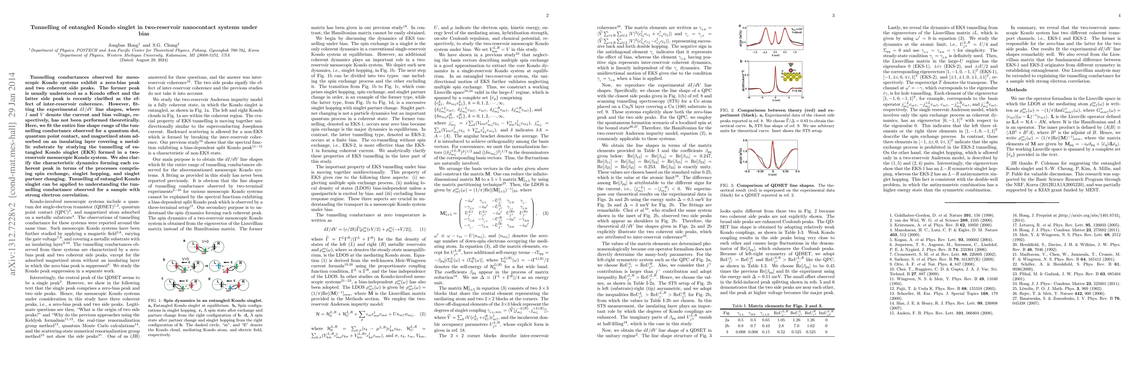 Tunnelling conductances observed for mesoscopic Kondo systems exhibit a zero-bias peak and two coherent side peaks. The former peak is usually understood as a Kondo effect and the latter side peak is recently clarified as the effect of inter-reservoir coherence. However, fitting the experimental $dI/dV$ line shapes, where $I$ and $V$ denote the current and bias voltage, respectively, has not been performed theoretically. Here, we fit the entire line shape range of the tunnelling conductance observed for a quantum dot, quantum point contact, and magnetized atom adsorbed on an insulating layer covering a metallic substrate by studying the tunnelling of entangled Kondo singlet (EKS) formed in a two-reservoir mesoscopic Kondo system. We also clarify the characteristic dynamics forming each coherent peak in terms of the processes comprising spin exchange, singlet hopping, and singlet partner changing. Tunnelling of entangled Kondo singlet can be applied to understanding the tunnelling conductance observed for a sample with strong electron correlation.