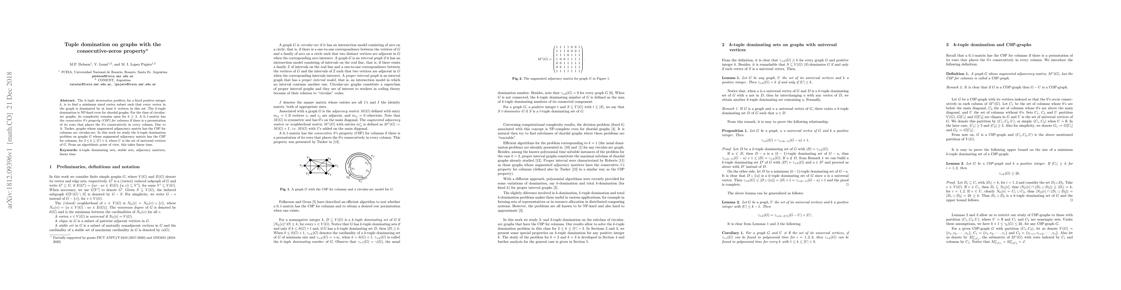 Researchers have developed a linear-time algorithm to solve the k-tuple domination problem on graphs with a specific property called consecutive-zeros property, which includes circular-arc graphs, for values of k between 2 and |U|+3.
