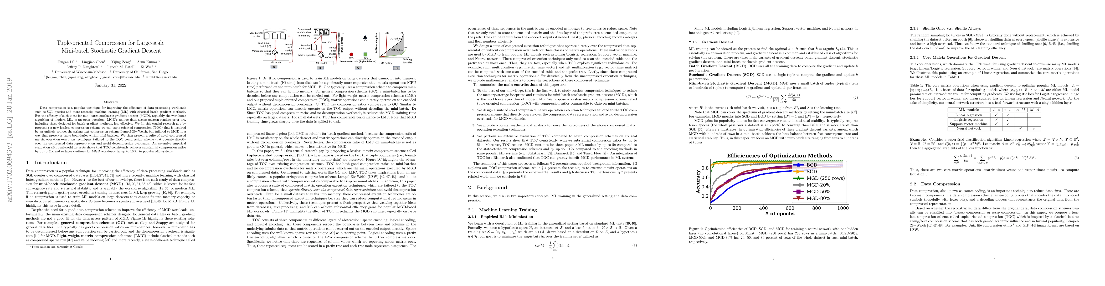 A new compression scheme called tuple-oriented compression (TOC) achieves up to 51x compression ratios and reduces runtime for large-scale mini-batch stochastic gradient descent by up to 10.2x in popular machine learning systems.