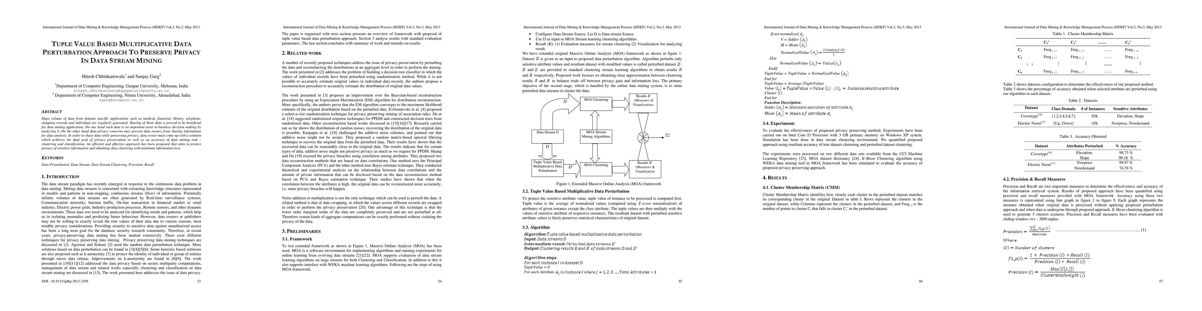 This paper proposes a tuple value based multiplicative data perturbation approach to preserve privacy in data stream mining. The method aims to balance privacy preservation and the accuracy of data mining tasks like clustering and classification, ensuring minimal information loss.